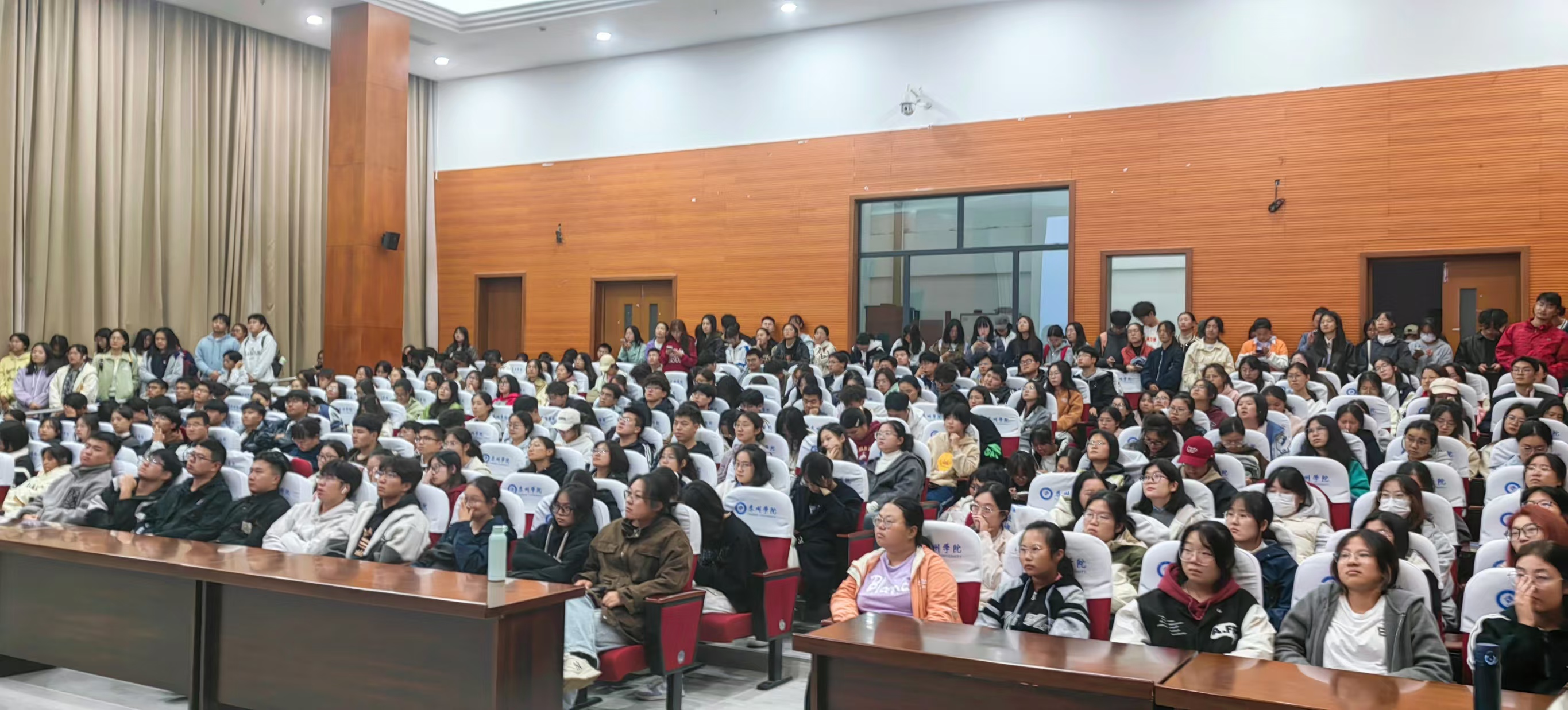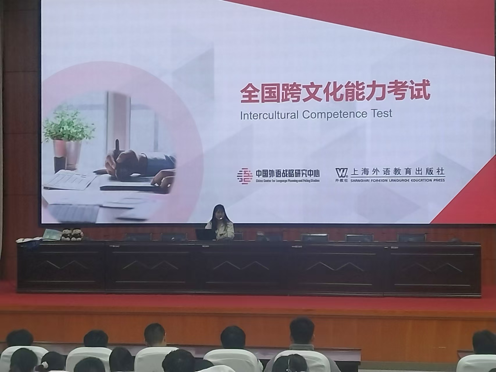 丁莉首先阐述发展跨文化能力的重要性,对外教社老师前来宣讲表达欢迎和感谢。随后,外教社柳源对全国跨文化能力考试进行了介绍,分享了考试实况,并在现场以真题为例和学生进行积极互动,现场气氛热烈。最后,徐佳结合本校考试数据和学校相关政策文件进行了补充介绍。