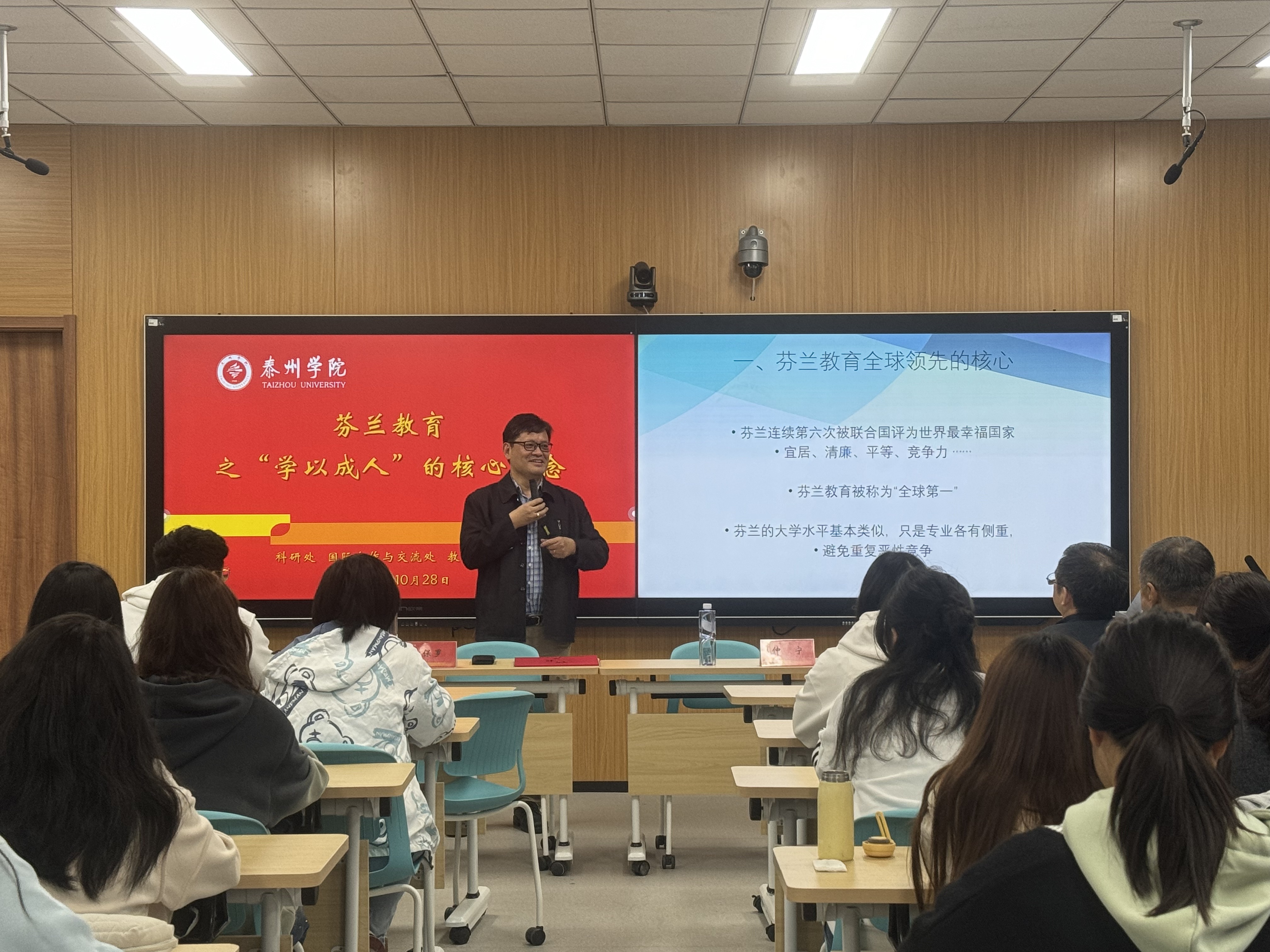 讲座中,黄保罗从芬兰教育全球领先的核心、当代教育所处的语境、教育的三大需求、芬兰教育的特色、学前教育发现和培养点、品格建造、现象/主题教学法等方面,介绍了芬兰教育中的“学以成人”理念。在互动环节中,黄保罗就在场师生提出的相关问题,进行了深入交流。
