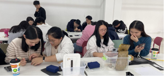 美术学院刘仪通老师为大家讲解了篆刻的历史渊源、文化内涵和基本技巧。在实践环节,师生们纷纷拿起刻刀和石料,尝试将艺术构思转化为生动的印章作品。大家相互交流、相互指导,从布局设计到线条镌刻,每一个步骤都充满了对传统艺术的尊重与热爱。在随后的讨论环节,辅导员们围绕“一站式”美育实践项目的运作进行了深入交流,苏辉作点评总结。