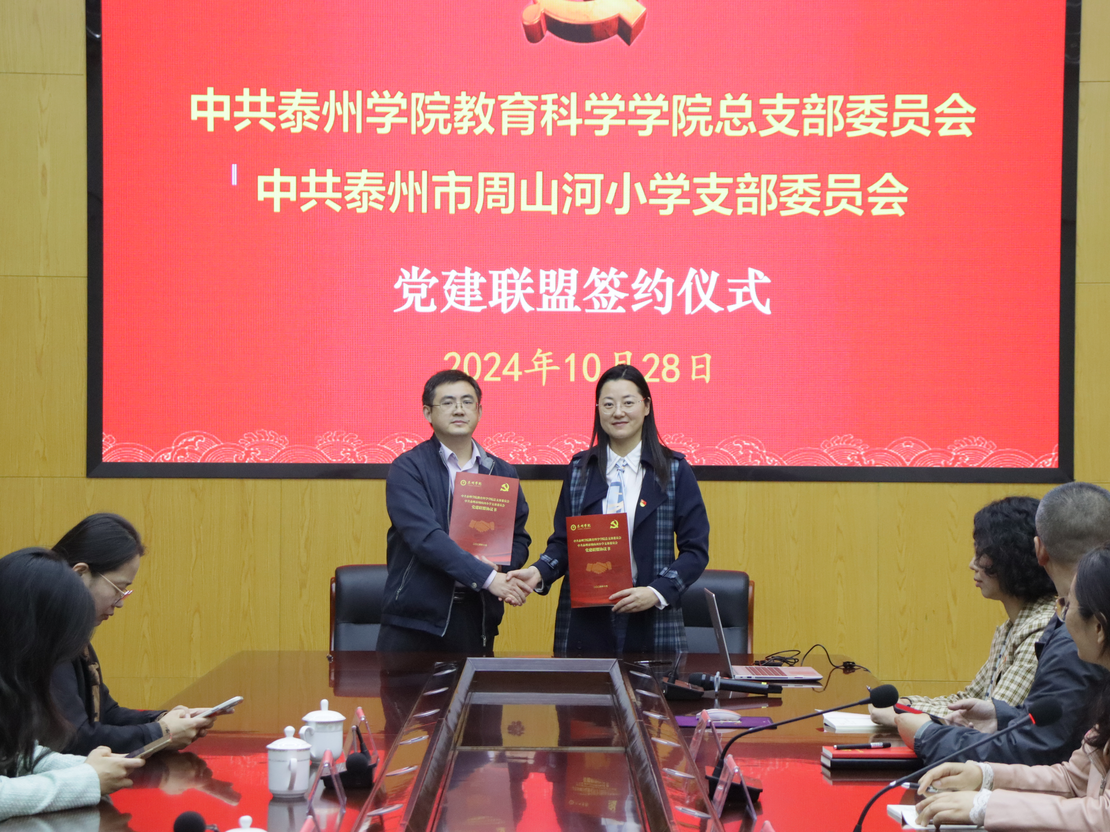 10月28日下午,中共bat365在线中国官网登录入口教育科学学院总支部委员会与中共泰州市周山河小学支部委员会共建党建联盟。泰州市周山河小学校长顾爱芳,见习校长陈婷,教育科学学院党总支书记仲宁,党总支副书记、副院长孙晓敏,副院长朱以财、徐莹莹,实习基地带队教师祝晶莹及学院14名实习生等参加活动。