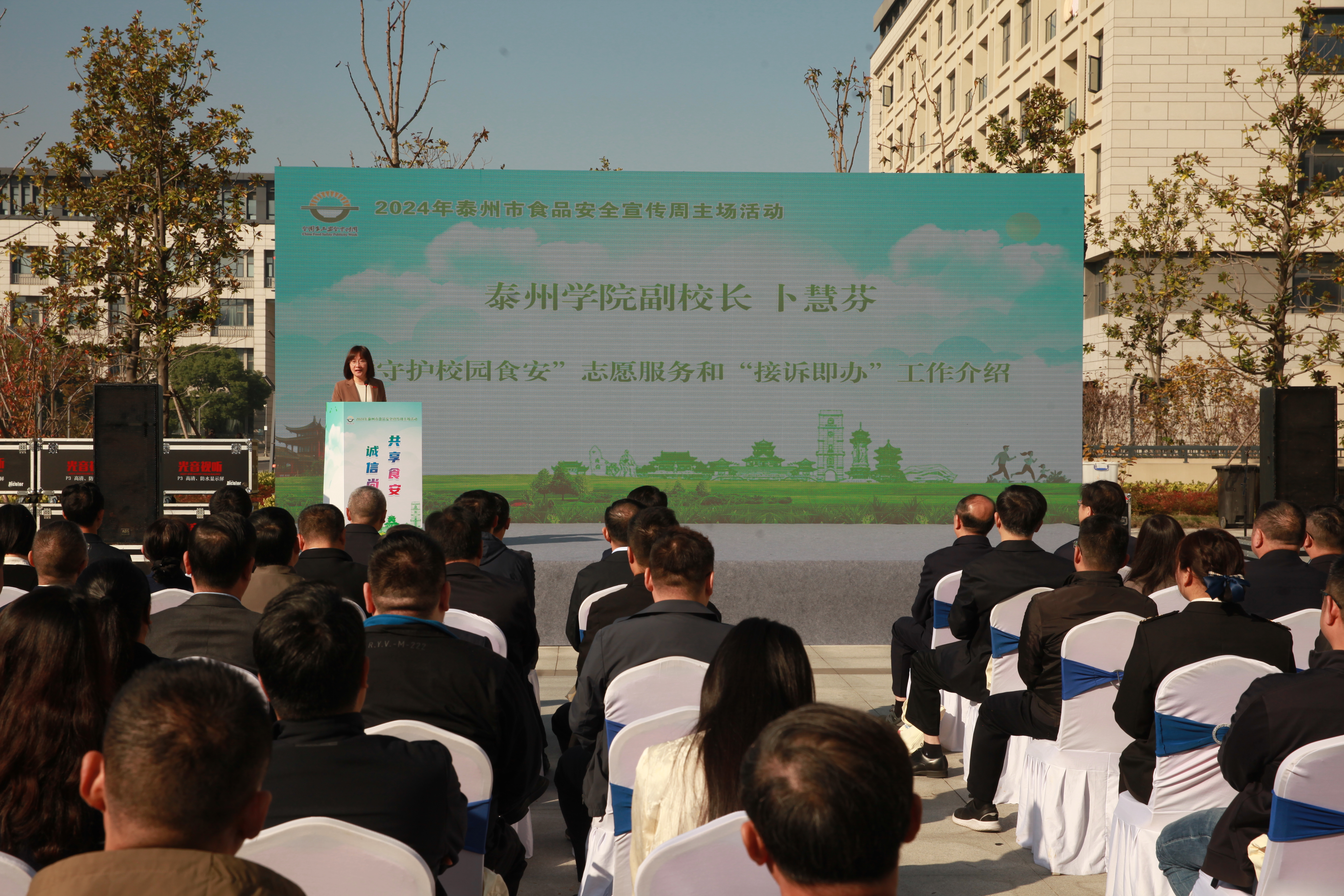 为进一步推动全社会广大干部群众共同关心、支持和参与食品安全工作,打造食品安全全社会共建共治共享共护新格局,10月30日上午, 泰州市2024年食品安全宣传周主场活动在bat365成功举办。市委常委、市政府常务副市长沈峻峰出席并宣布活动正式启动。市政府副秘书长申兵,市质量发展和食品药品安全委员会办公室主任、市市场监管局局长张汉刚,bat365在线中国官网登录入口党委副书记、校长季赛,bat365在线中国官网登录入口党委常委、副校长卜慧芬,市食安委成员单位分管负责人,各市(区)、泰州医药高新区市场监管局主要负责人,以及部分学校代表,企业代表参加活动。