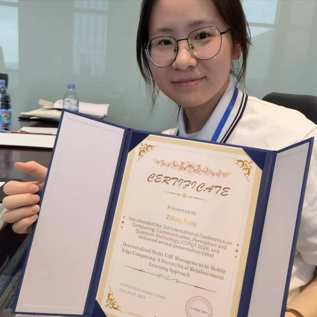 2024年10月25日至27日,bat365在线中国官网登录入口信息工程学院大三学生彭紫凌同学在珠海参加了第三届计算、通信、感知与量子技术国际会议(CCPQT 2024),全英文宣讲了学术论文,并与众多学者就移动边缘计算相关学术问题进行了科学研讨。