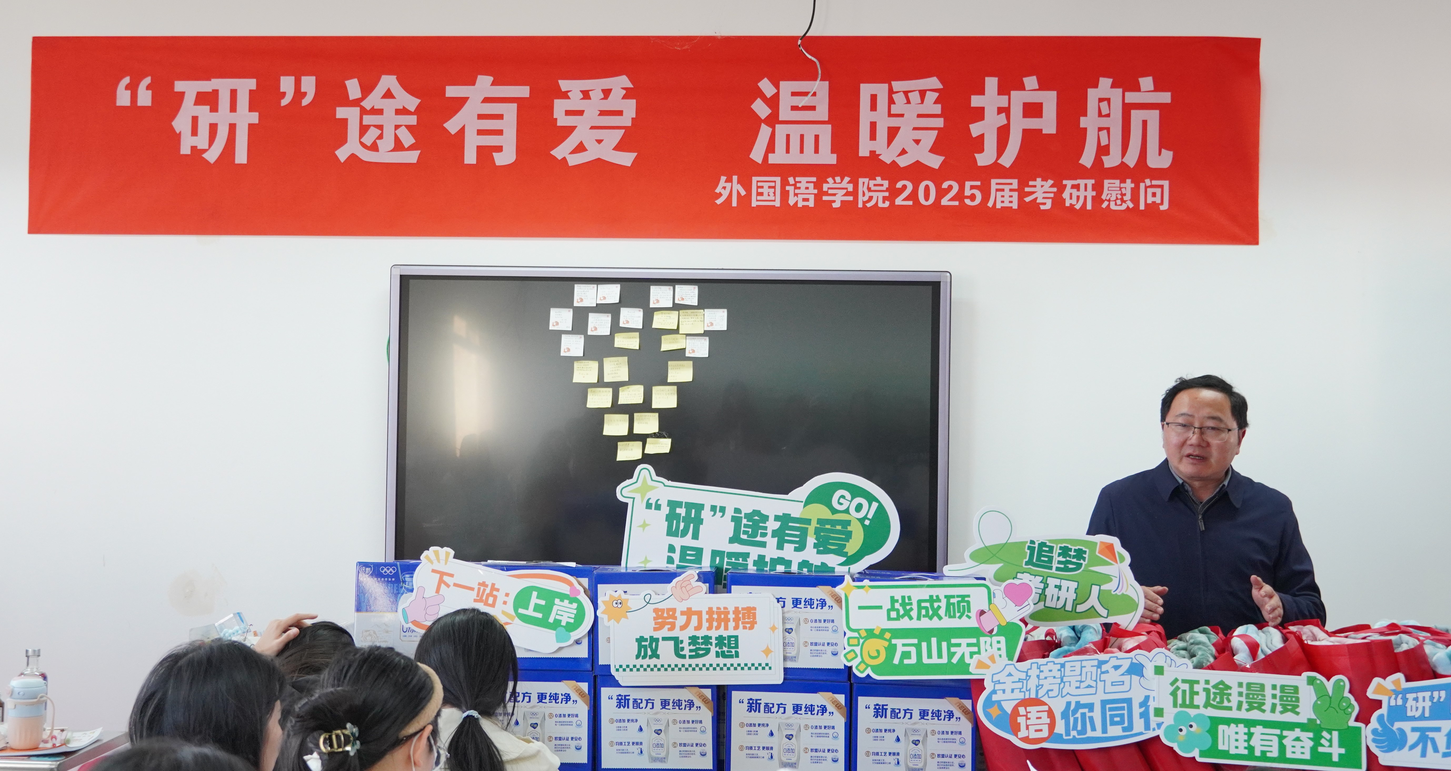 护航逐梦路,情系考研人。为帮助考研学生缓解备考压力,坚定考研信心,提升冲刺决心,11月6日下午,外国语学院在A2140教室举办“‘研’途有爱,温暖护航”2025届考研慰问活动。学院党总支书记练红珍、院长李更春、副院长周侠、丁莉、全体辅导员以及25届考研学生参加。