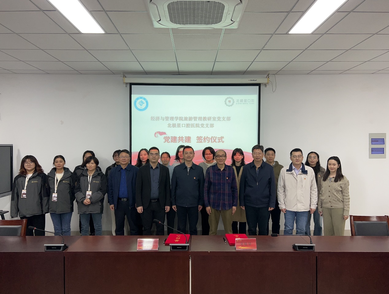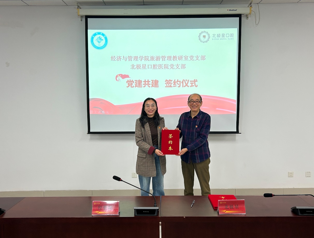 旅游管理教研室党支部书记宋欢和北极星口腔医院党支部书记李荣共同签署了党建共建协议,双方共同表示,将围绕“大健康”主题,通过党建引领,共同推动医疗、教育领域的深度合作,以实现资源共享、优势互补,打开院医党建和医管融合新局面。