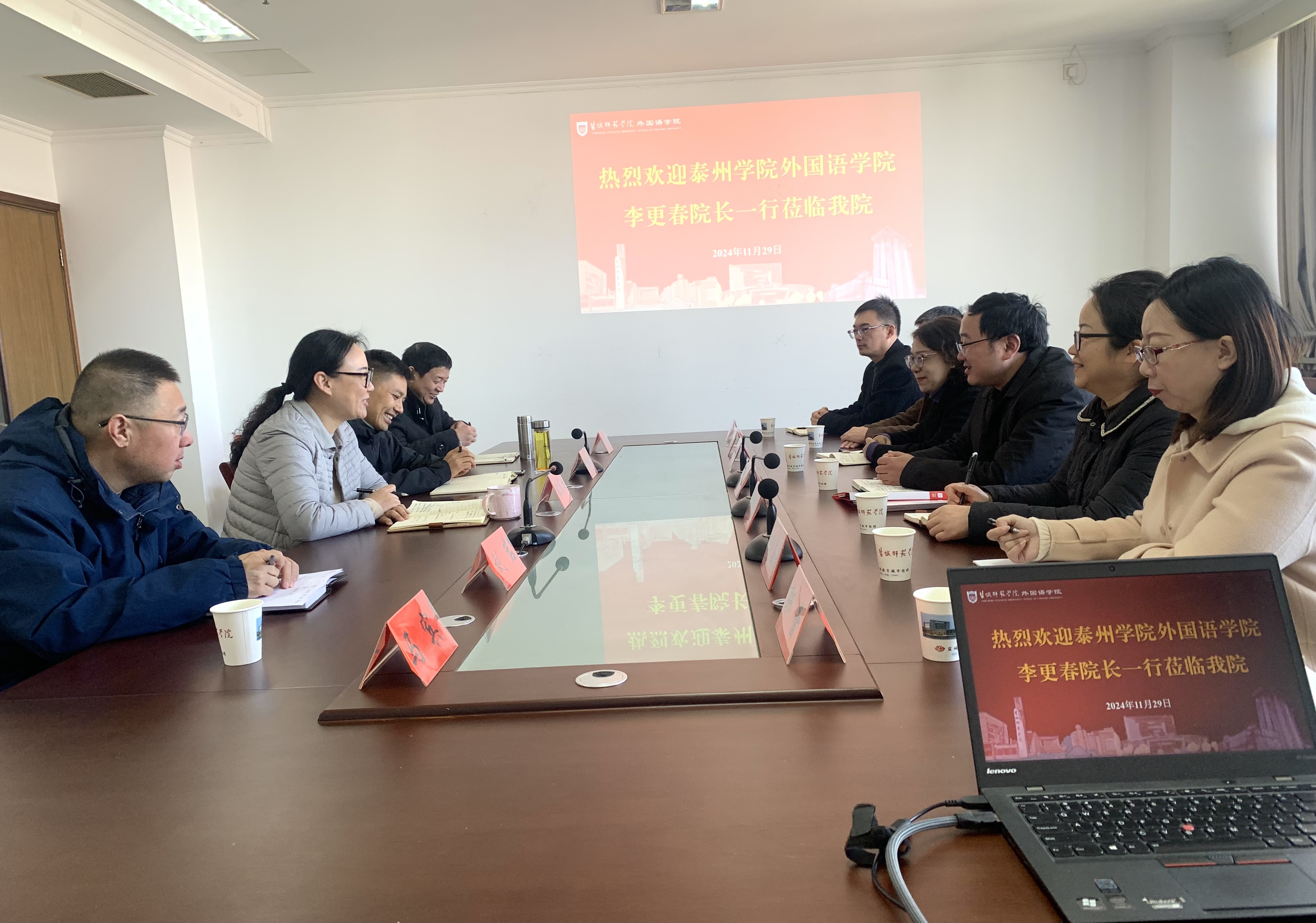 11月29日,外国语学院院长李更春、副院长周侠、副院长兼大学外语教学部主任丁莉等一行7人,赴盐城师范学院外国语学院学习交流。盐城师范学院外国语学院党委书记张宾州、副院长周海明、英语教育系主任刘岩、商务英语系主任苏军锋、翻译系主任马宾等参加了座谈。