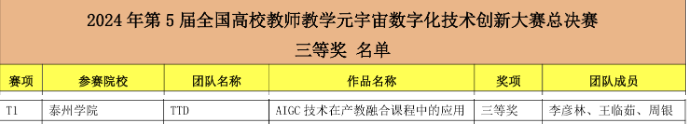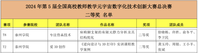 11月23日,第5届全国高校教师教学元宇宙数字化技术创新大赛全国总决赛落下帷幕,bat365机电工程学院联合贯通培养项目合作校——泰州职业技术学院智能制造学院共同打造三个团队参赛,团队经过项目报告、讲解、说课、答辩等多个环节的激烈角逐,最终取得优异成绩:“专注仿真技术队”(团队成员:徐晓栋、许胜、俞冬平、李卫民)、“爱3D创作队”(团队成员:龚玉玲、周银、王小羊、张斌)荣获国家级二等奖,“TTD队”(团队成员:李彦林、王临茹、周银)荣获国家级三等奖。
