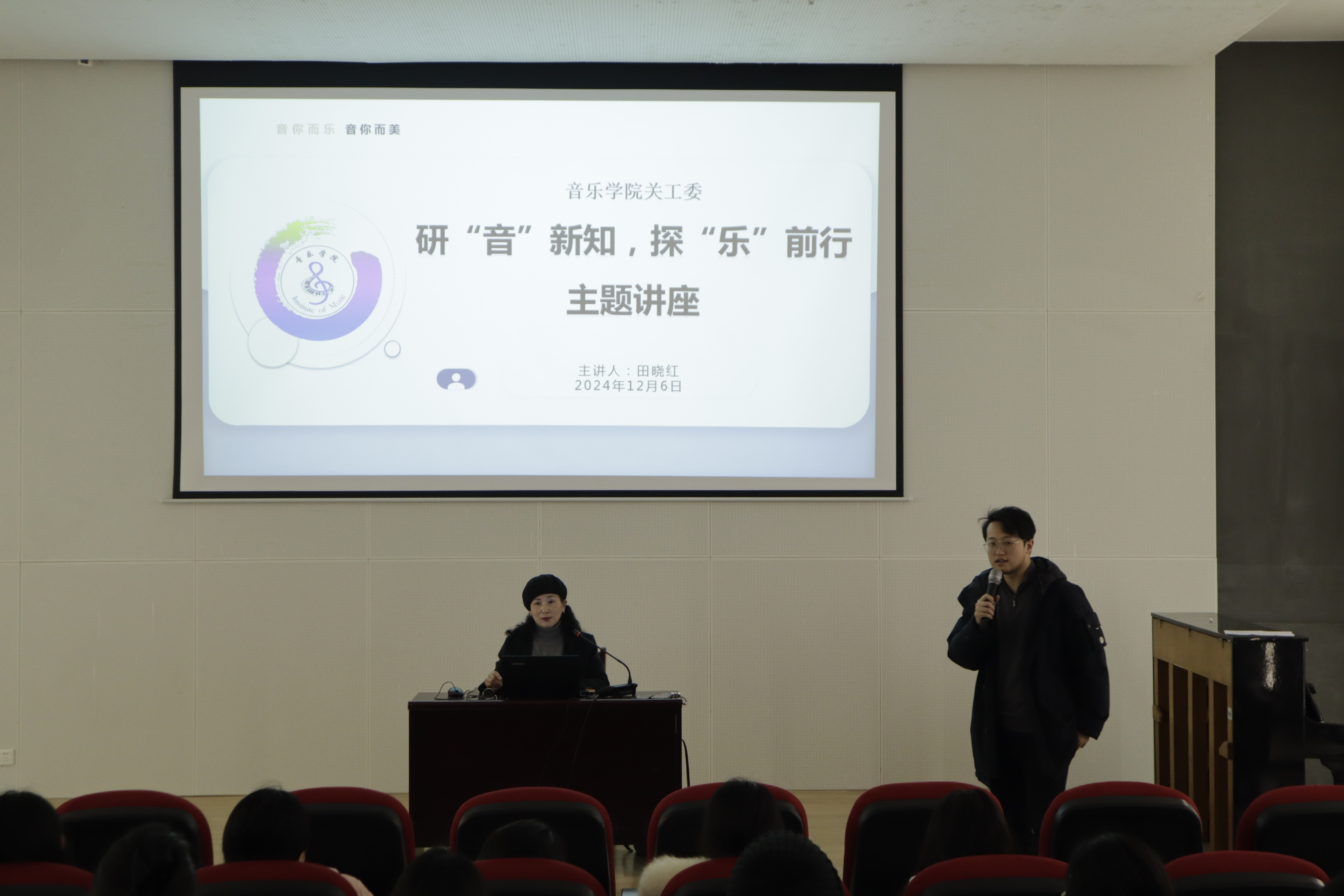 12月6日,音乐学院“大音讲堂”第三期活动在音乐楼H4101报告厅举行,本次活动主题为《“研‘音’新知,探‘乐’前行”》,学院特邀泰州市海陵区名师班成员、原泰州市海光中心小学艺术教研组组长田晓红老师主讲,学院25、26届共计80余名音乐学(师范)专业同学参加此次讲座,讲座由蔡宁远老师主持。