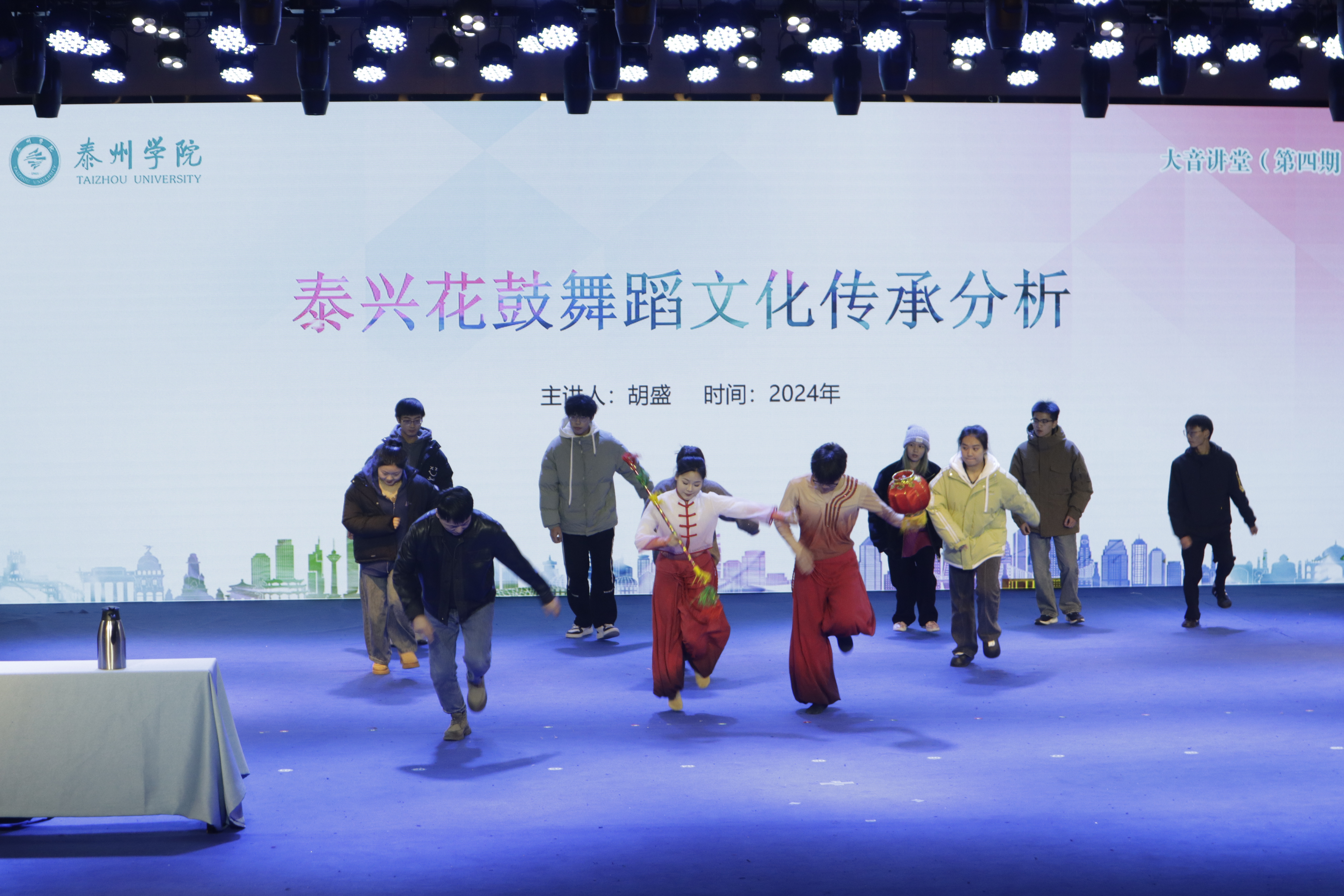 胡盛先生作为泰兴花鼓的代表性传承人,不仅在技艺上有着深厚的造诣,更在文化传承上有着独到的见解和丰富的实践经验。他详细介绍了泰兴花鼓的历史渊源、艺术特色以及在当代社会的传承与发展情况,并展示了泰兴花鼓的经典舞蹈动作。他指出,泰兴花鼓作为江苏省泰兴市的传统舞蹈,承载着深厚的文化底蕴和独特的地域特色,是中华民族文化宝库中的瑰宝。他鼓励师生们积极参与到非物质文化遗产的保护和传承中来,让这一传统艺术形式在新时代焕发新的活力。胡盛先生现场还与师生互动,让在场的每一位听众感受泰兴花鼓的独特魅力。
