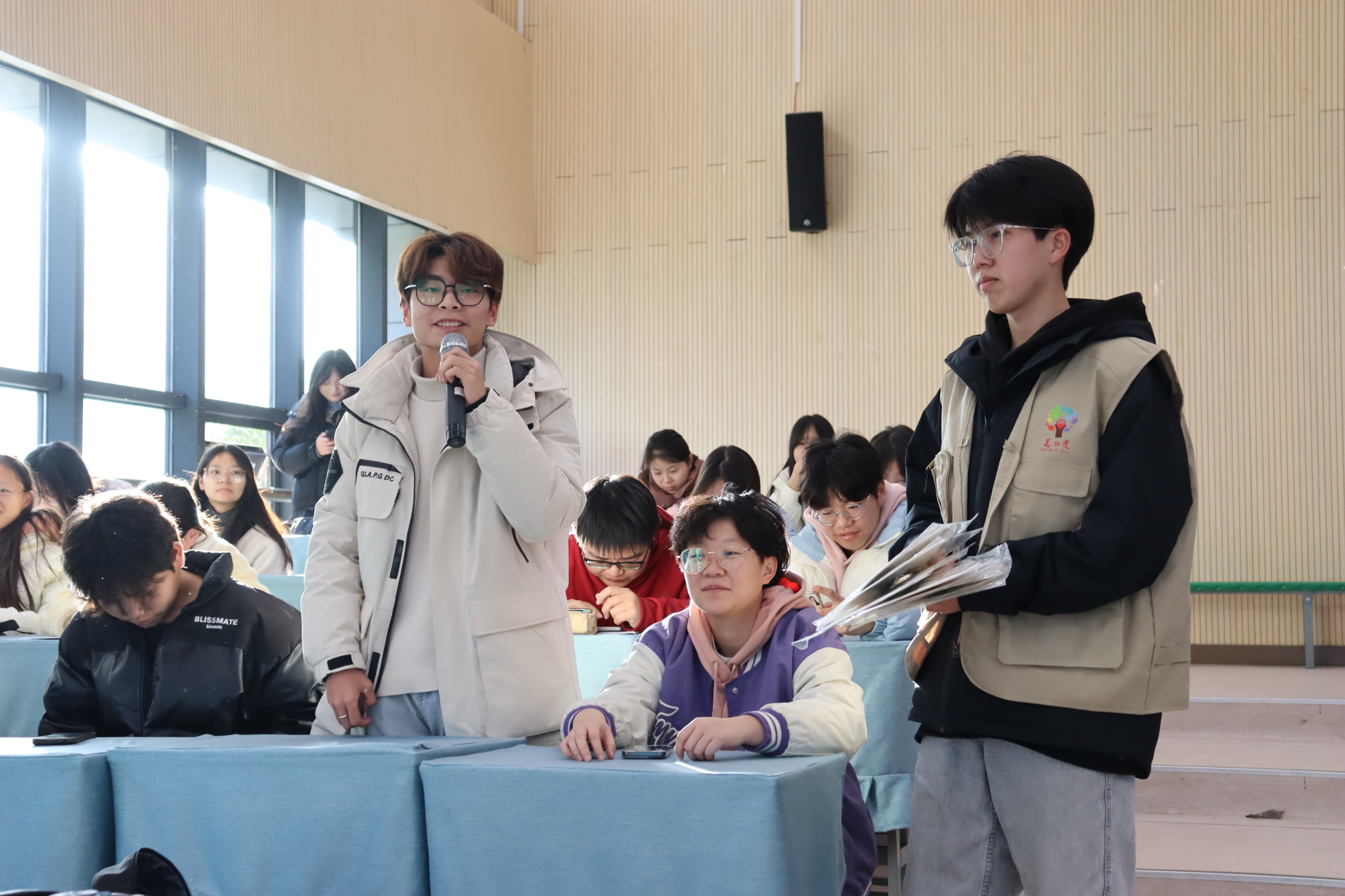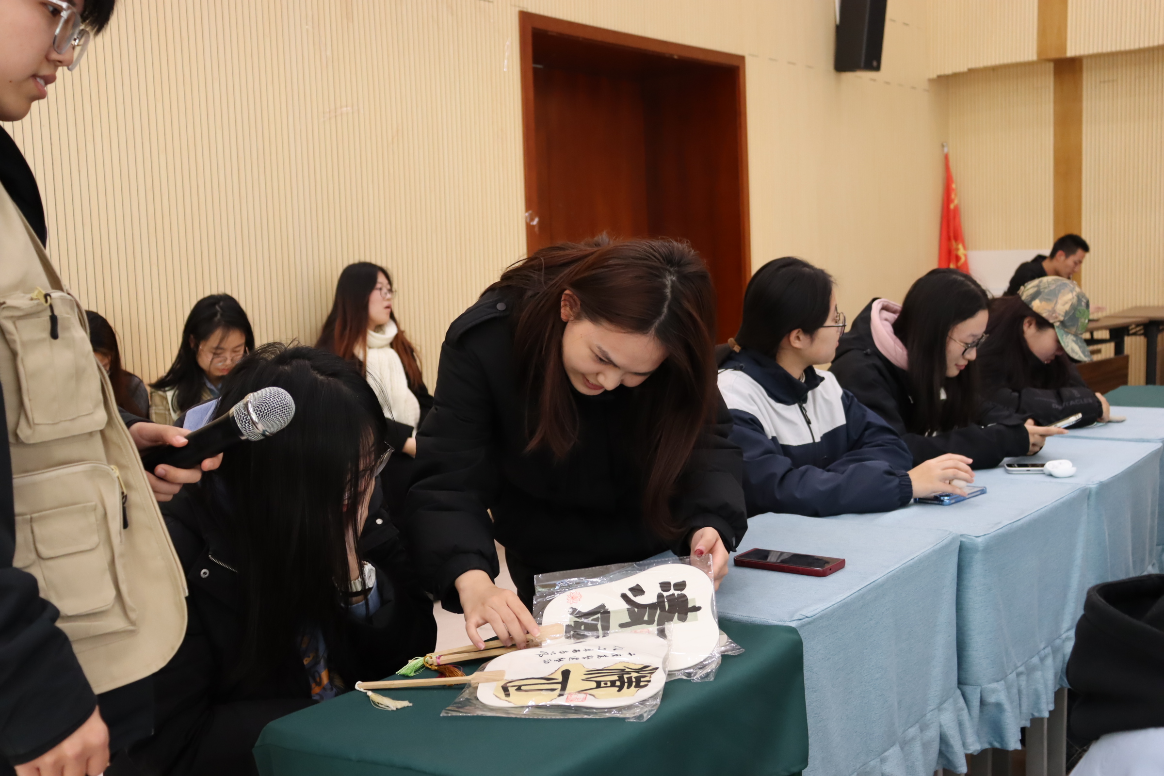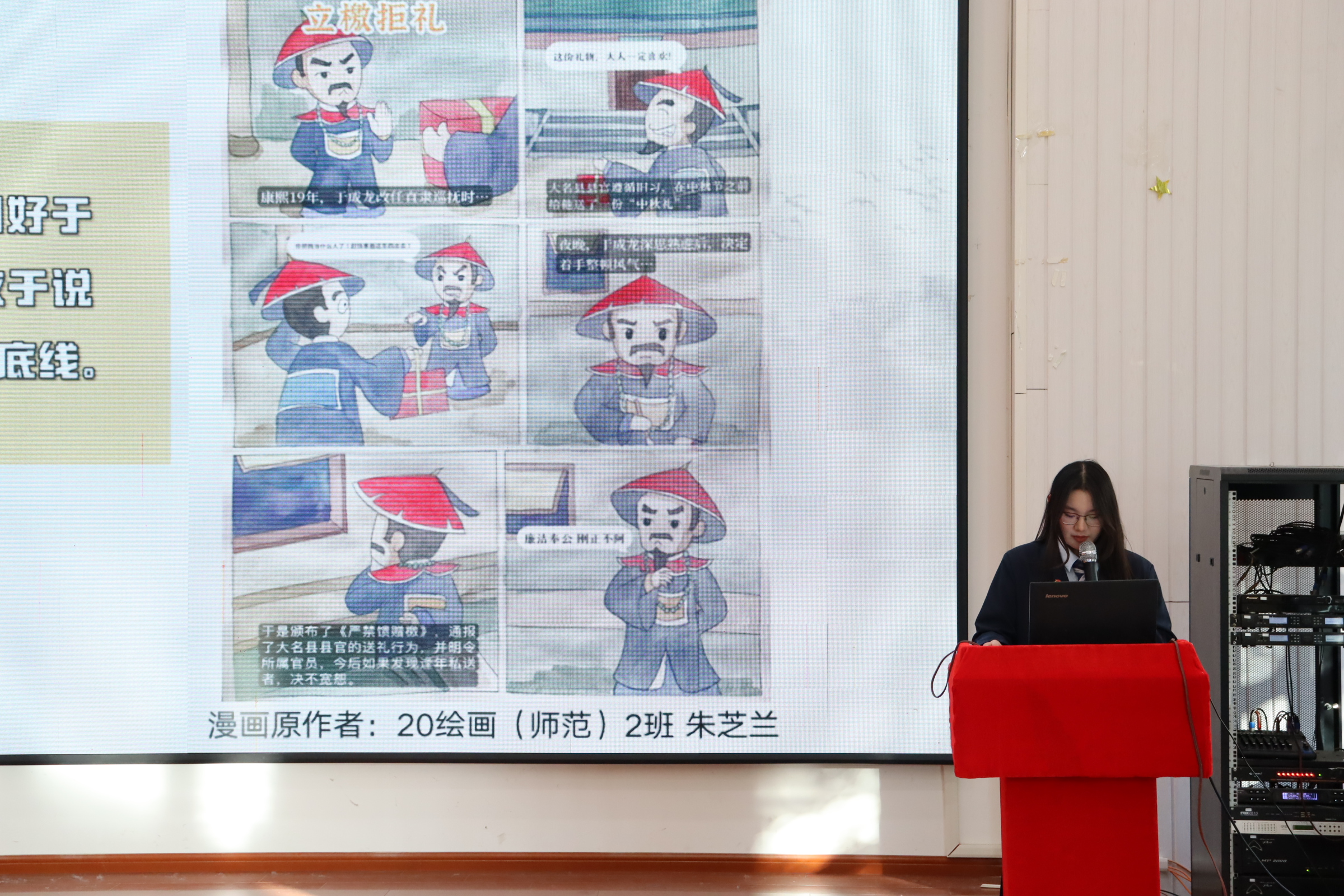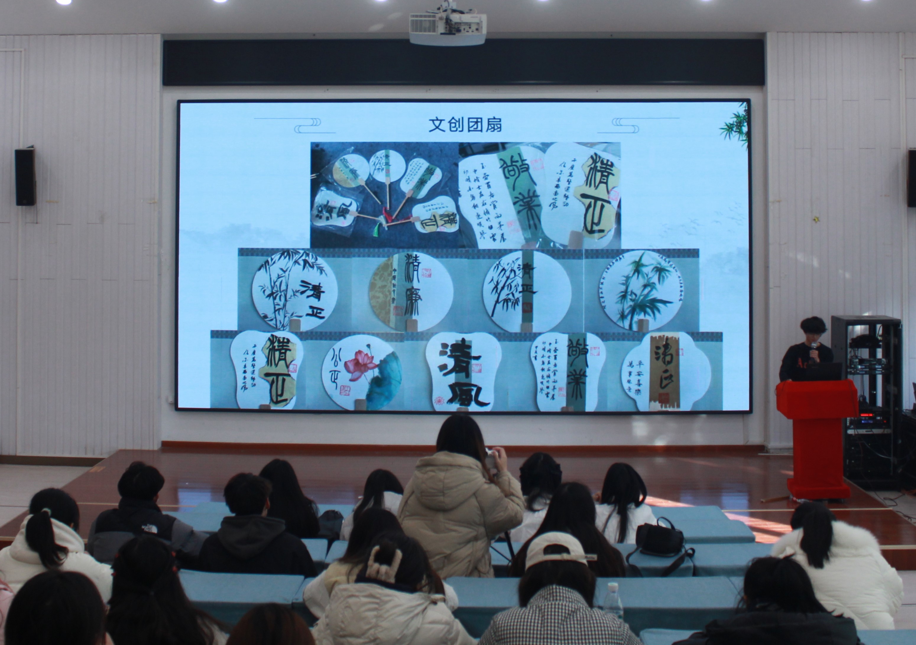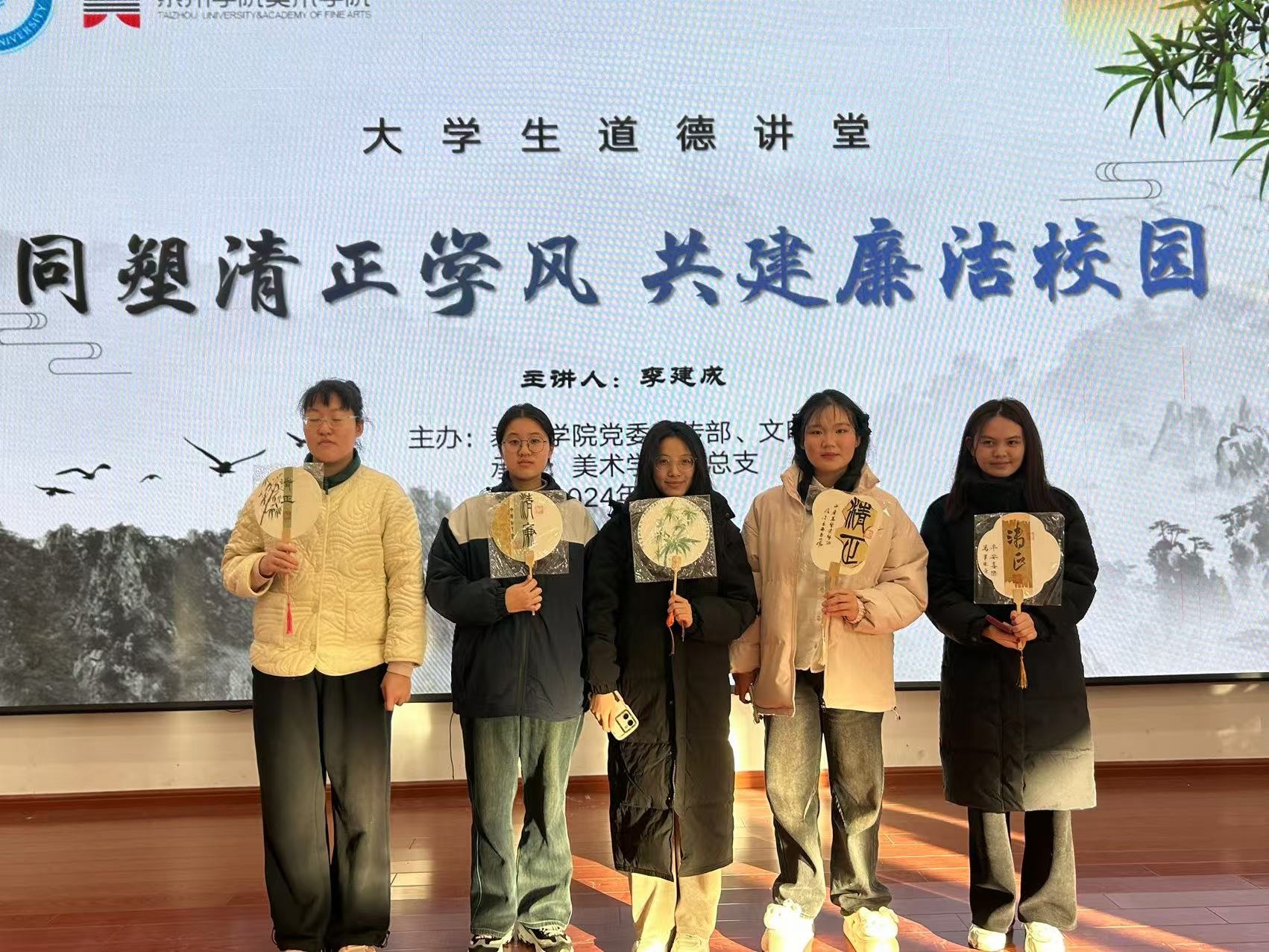 本次道德讲堂精心设置七个环节:做省身、看视频、颂经典、做分享、乐互动、谈感悟、送祝福。活动伊始,主持人抛出问题,引导同学们深刻省身,迅速切入主题。随后播放的视频将书法名家与清正廉洁紧密相连,颜真卿公正无私、为官清廉的形象跃然眼前。讲堂过程中,美术学院学生代表激情朗诵,郑重提醒众人坚守道德底线;时毓同学则以生动漫画故事,深入讲解廉洁精神。临近尾声,同学们热烈互动,各抒己见,畅谈对清正学风与廉洁校园的理解。最后,美术学院为大家送上独具匠心的文创“廉洁团扇”。