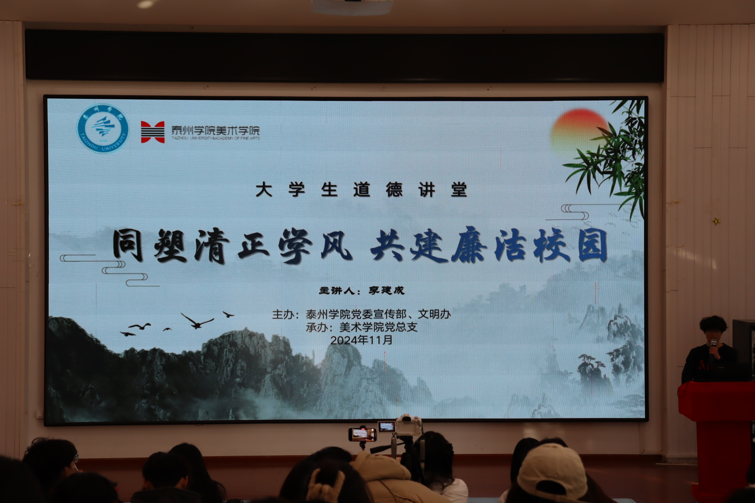 为大力弘扬廉洁精神,积极营造优良学风,11月29日下午,由校党委宣传部、文明办主办,美术学院党总支承办的“同塑清正学风共建廉洁校园”道德讲堂活动于艺术楼C2108举办,各二级学院学生代表参与活动。