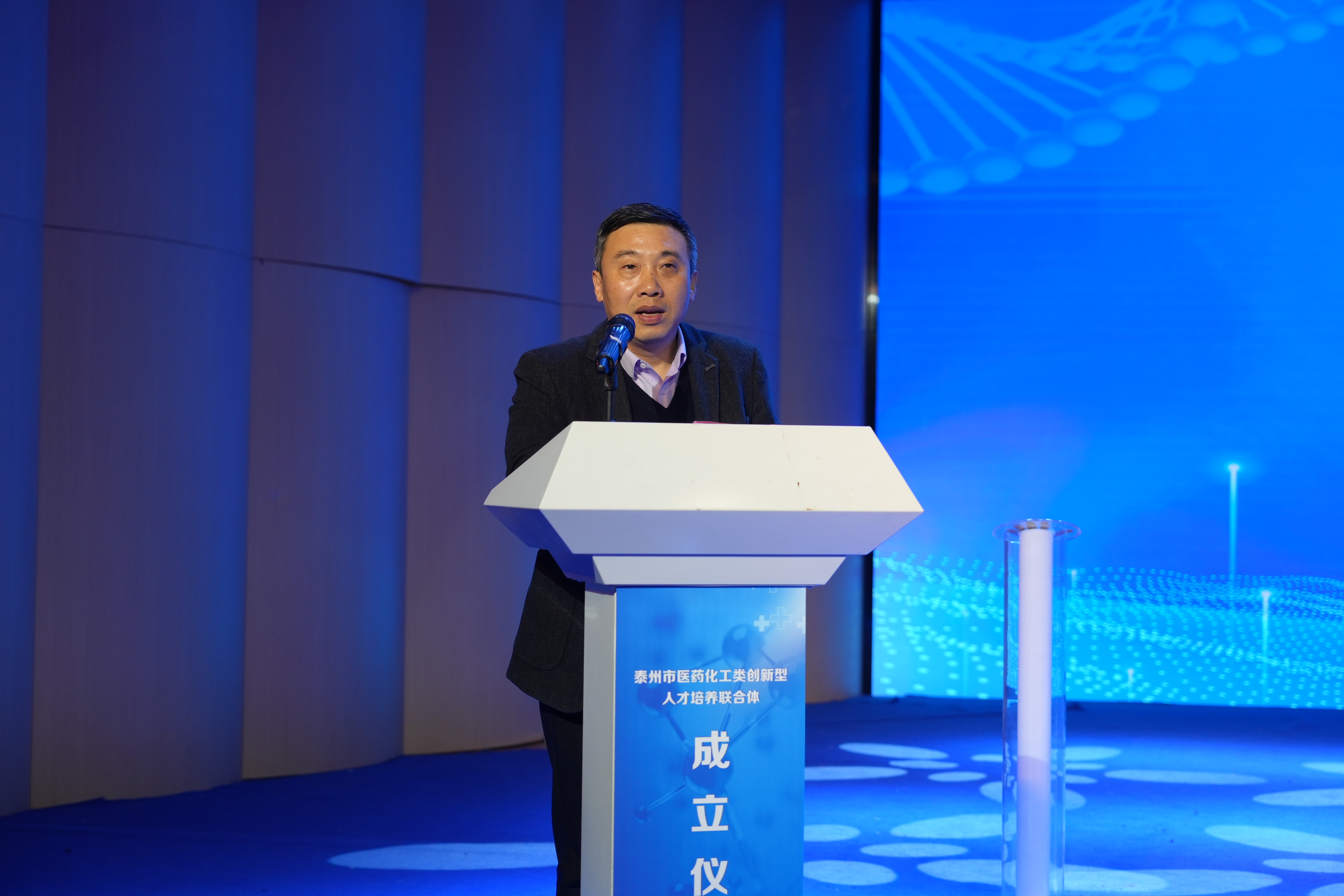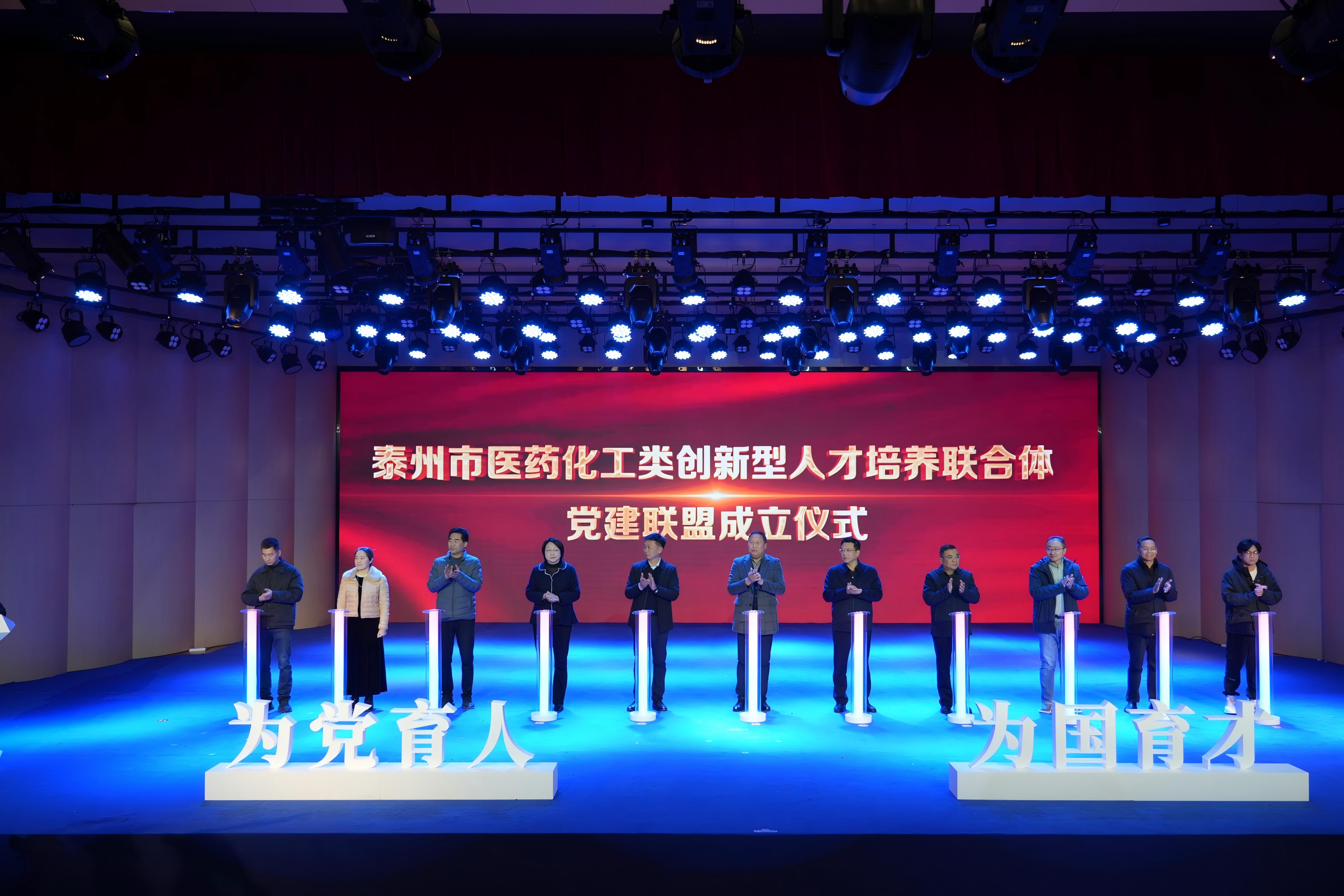泰州市医药化工类创新型人才培养联合体成立仪式环节,市委组织部、市教育局、市科技局、市生态环境局、市药检院、在泰高校、苏中药业等部门(单位)领导共同上台按下启动柱,标志着一个全新的合作平台正式搭建,为谱写医药化工类创新型人才培养崭新篇章汇聚力量。