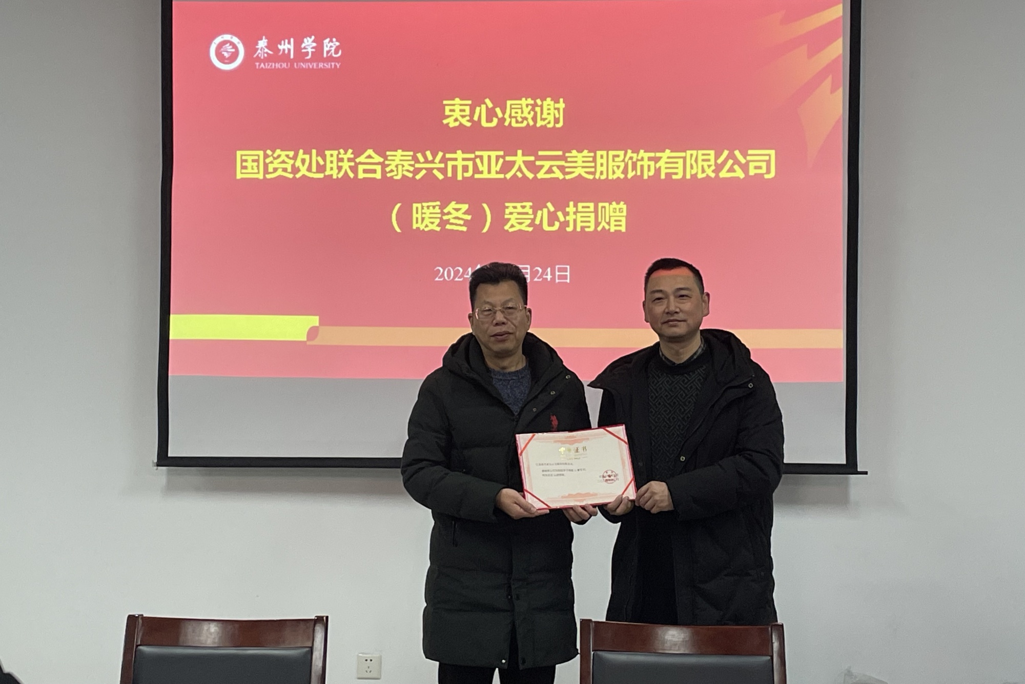 12月24日,国资处联合江苏省泰兴市亚太美服饰有限公司开展“暖冬”爱心捐赠行动,为经济与管理学院学子送来关怀。