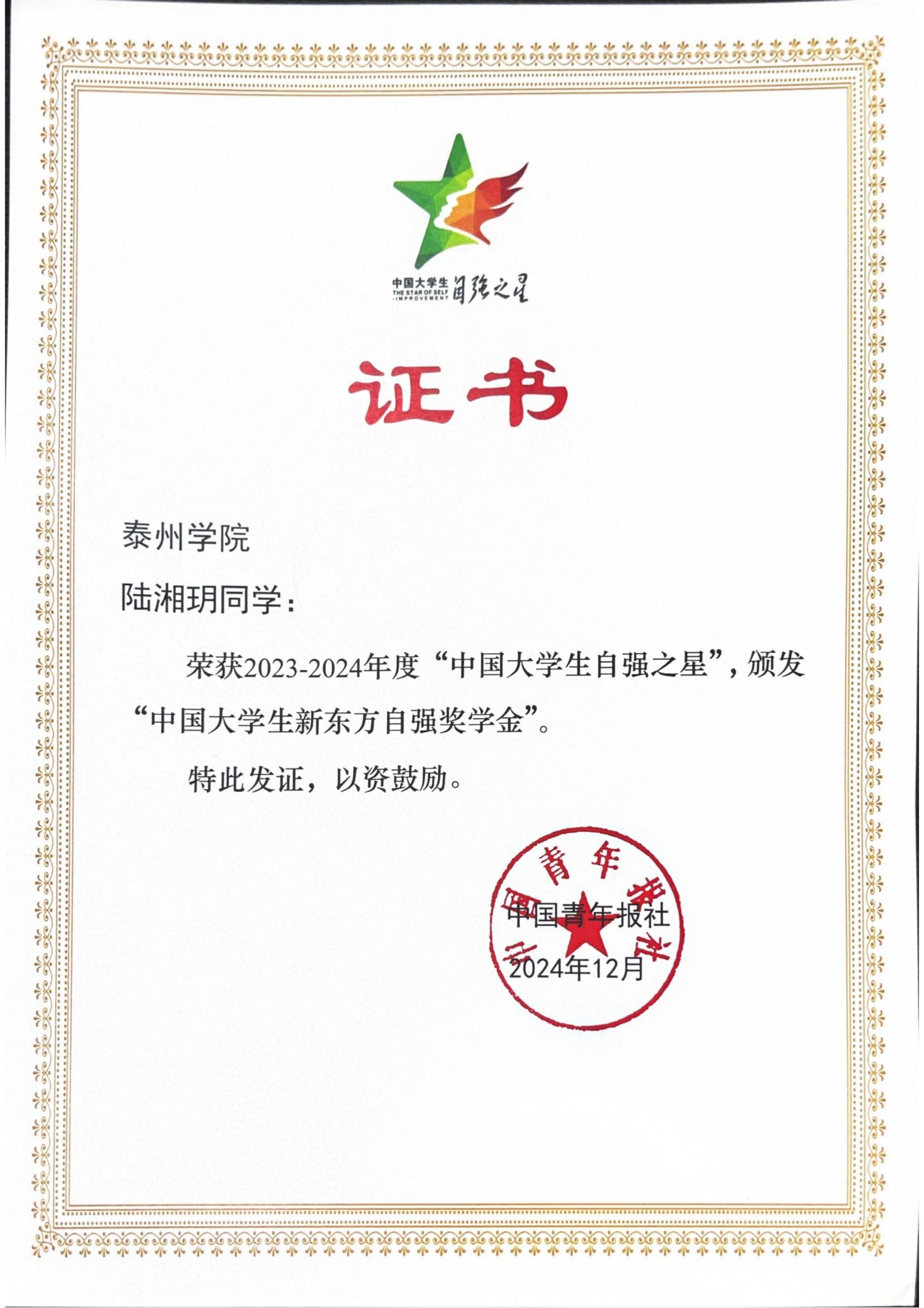 近日,由共青团中央、全国学联指导,团中央基层建设部、中国青年报社主办的2023-2024年度“中国大学生自强之星”奖学金推报活动评选结果揭晓,bat365外国语学院陆湘玥同学获评“中国大学生自强之星”荣誉称号,获颁“中国大学生新东方自强奖学金”。