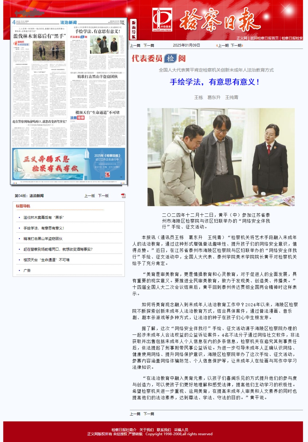 《检察日报》2025年1月9日报道《全国人大代表黄平肯定检察机关创新未成年人法治教育方式 手绘学法,有意思有意义!》