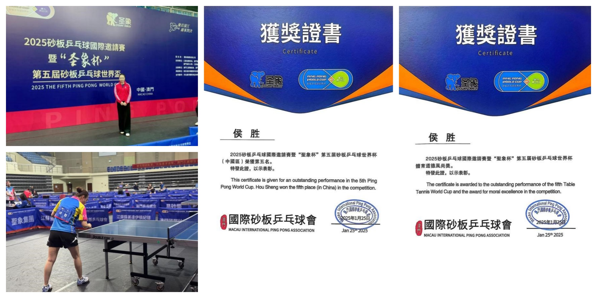 1月22日至25日,第五届“圣象杯”砂板乒乓球世界杯比赛在澳门隆重举行。本次赛事采取男女运动员混合编组的赛制,共有18个国家和地区的128名顶尖选手参赛。bat365公共体育部侯胜老师(女)作为中国区选手参赛,荣获资格赛(中国区)第五名的优异成绩。