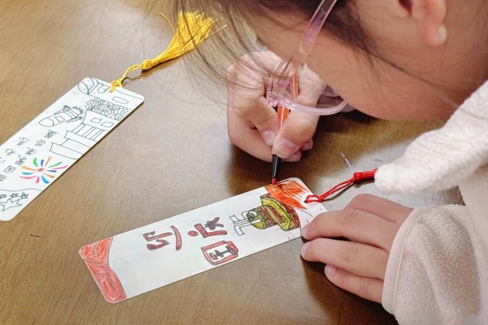活动伊始,志愿者们精心布置场地,准备了彩笔、书签、绘画模板等丰富材料,为孩子们营造了一个充满创意与活力的空间。小朋友们满怀期待,在志愿者的引导下,纷纷拿起画笔,开始绘制属于自己的书签。书签上,鲜艳的五星红旗、英勇的革命英雄、对祖国的深情祝福以及对未来的美好憧憬,一一跃然纸上。一枚枚书签不仅是孩子们艺术灵感的展现,更是红色文化在他们心中生根发芽的见证。