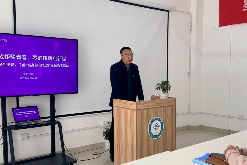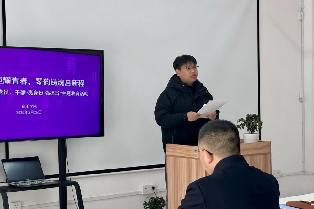 活动现场,音乐学院党总支书记陈鹏强调,学生党员、学生干部在工作和生活中要亮身份、强担当、树形象,要以政治底色立根、实干担当尽责、榜样示范引领,争做信念坚定的“追光者”、攻坚克难的“排头兵”和服务师生的“暖心人”。学生代表耿志微结合“身份、担当、传承”关键词,倡议学生党员干部带头服务同学、带头破解难题。