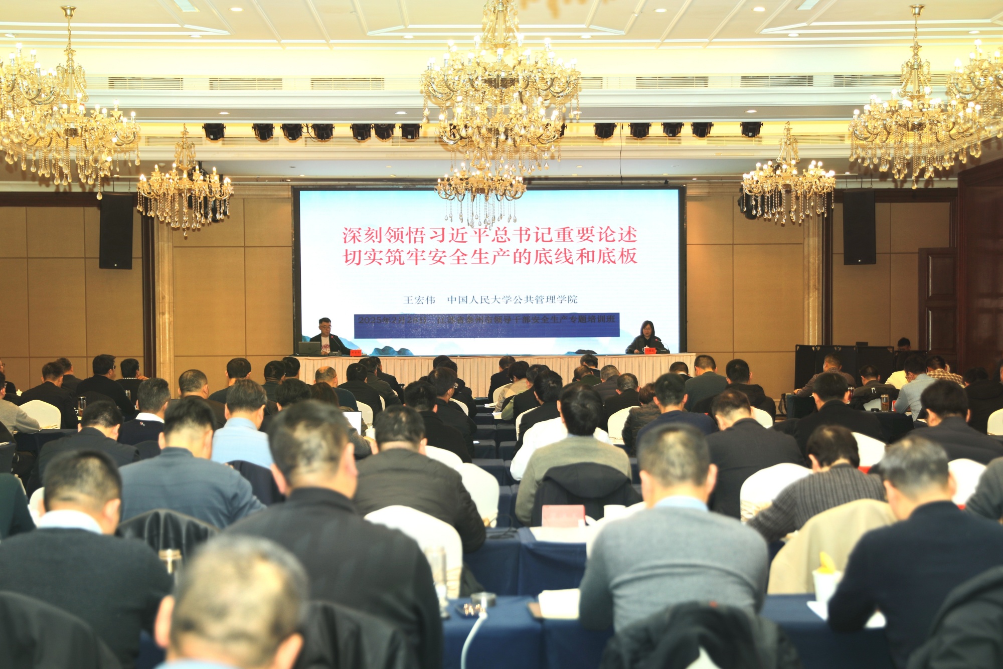 培训班邀请省应急管理厅原总工程师苏斌和中国人民大学教授王宏伟,分别以《牢记“国之大者”,以一域之安助全省之稳》和《深刻领悟习近平总书记重要论述,筑牢安全生产的底线和底板》为主题作专题讲座报告。培训期间,全体学员还集中观看了2024年度泰州市安全生产警示教育片。各市(区)应急管理工作分管负责人、市安委会成员单位分管负责人、市应急管理局领导班子成员和各处室(单位)负责人、各市(区)应急管理局领导班子成员参加学习。