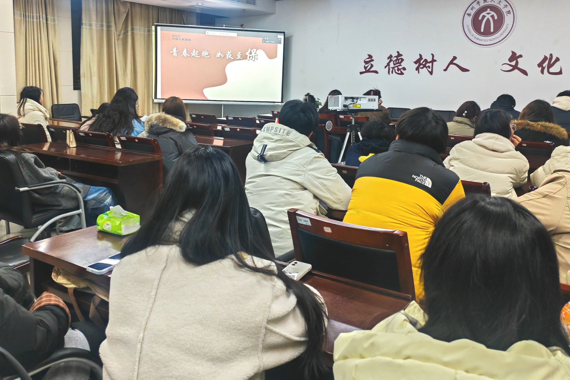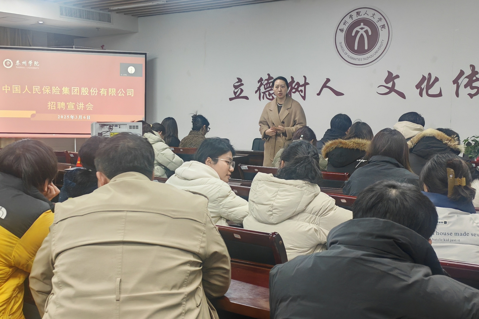 为切实帮助2025届毕业生拓宽就业渠道,提升就业质量,3月6日晚,人文学院针对法学系毕业生举办中国人民财产保险股份有限公司泰州分公司专场招聘宣讲会。宣讲会采用线上+线下双线联动模式,班主任带队近百名知识产权专业学生参加。