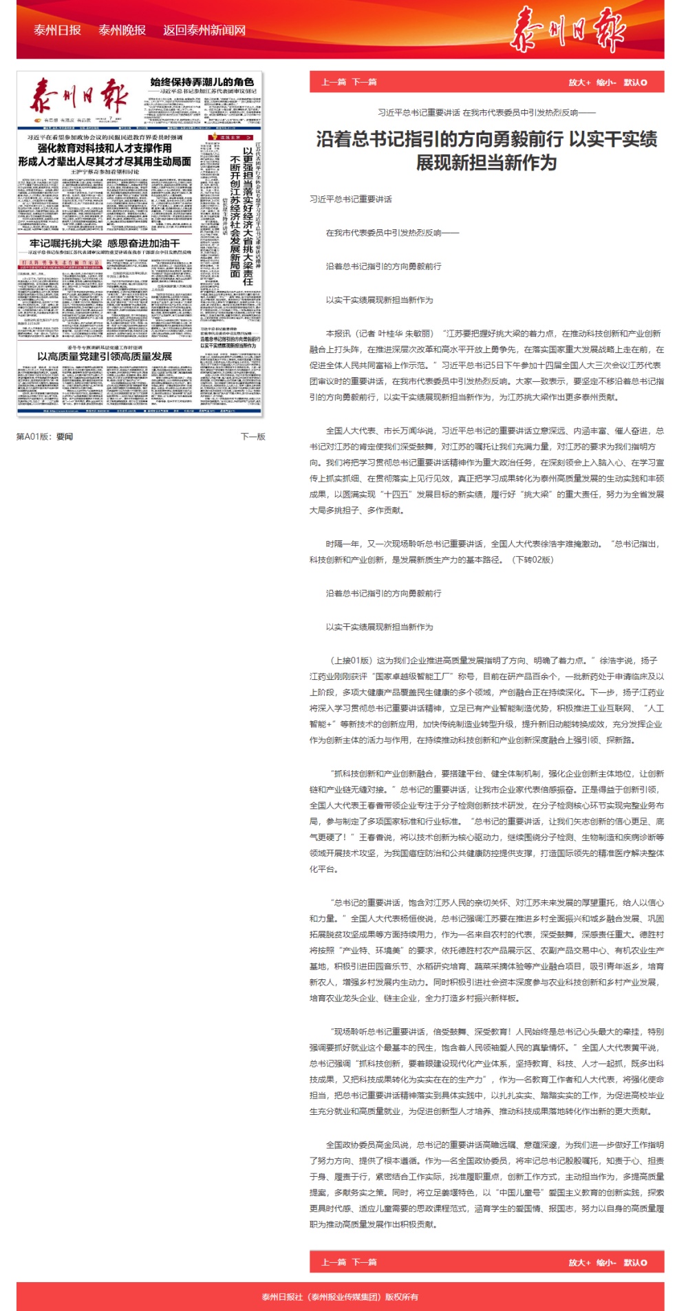 《泰州日报》2025年3月7日报道《习近平总书记重要讲话 在我市代表委员中引发热烈反响》
