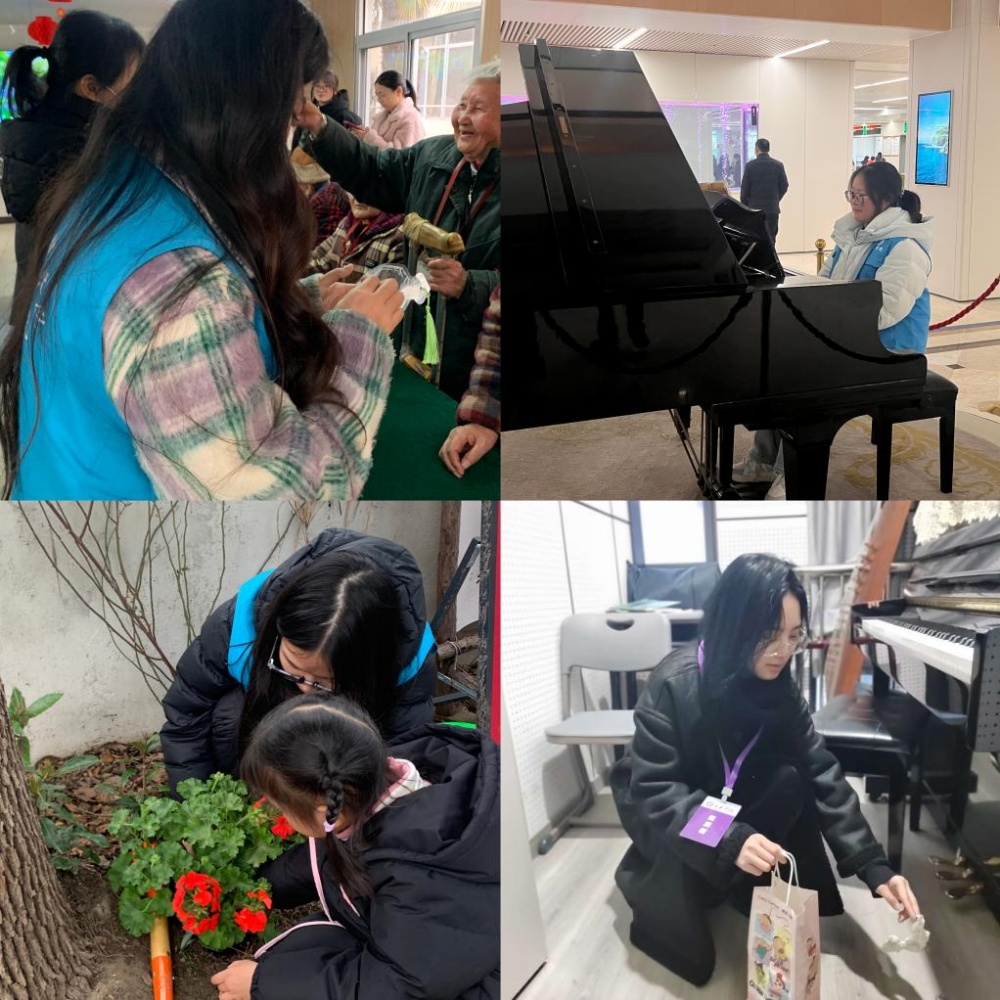 “星愿和声”护成长。志愿者走进泰州市社会福利院,通过奥尔夫音乐游戏《虫儿飞》引导特殊儿童感知节奏,量身定制“手势舞+简易打击乐”融合课程。“艺彩晚晴”慰银龄。在康莲苑老年公寓,志愿者为老人们带来了一场温馨且意义非凡的音乐之旅。当《我和我的祖国》旋律响起,志愿者们与老人们齐声合唱。表演完毕后,大家围坐在一起,共同制作精美书签。“音愈微光”抚人心。在泰州市人民医院,“音愈微光” 小组的志愿者弹奏钢琴,以音乐理疗的独特方式舒缓着人们紧张的神经,让每一个身处其中的人感受到心灵的治愈。“‘童’植新苗”筑希望。党总支还联合鑫龙社区、维斯顿幼儿园开展了 “‘童’植一棵树” 活动。大家齐心协力栽下花苗,共同为保护环境贡献力量,让雷锋精神在绿色行动中得以延续。“音境焕新”靓家园。在校园内,志愿者专注于音乐楼琴房及周边环境的整治。他们清理卫生死角,规范电动车停放,为音乐学习与创作环境注入新活力。