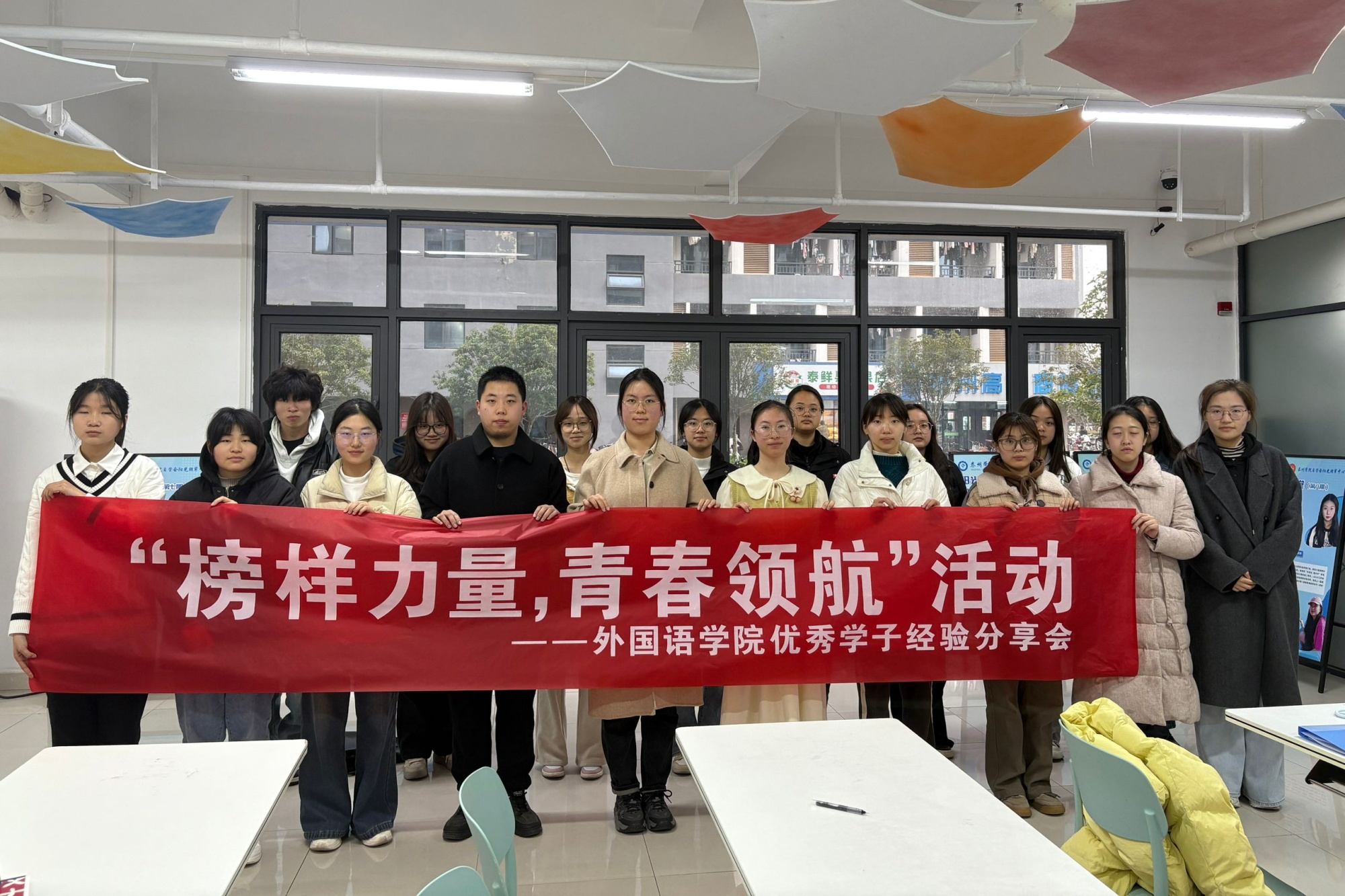 为进一步发挥榜样的先锋引领作用,激励广大学子奋发自强,突破自我,3月14日,外国语学院于一站式学生社区举办“榜样力量,青春领航”优秀学子经验分享会。分享会邀请国家奖学金获得者、省优秀学生干部、校十佳大学生作为主讲嘉宾,各年级学生代表80余人参会。