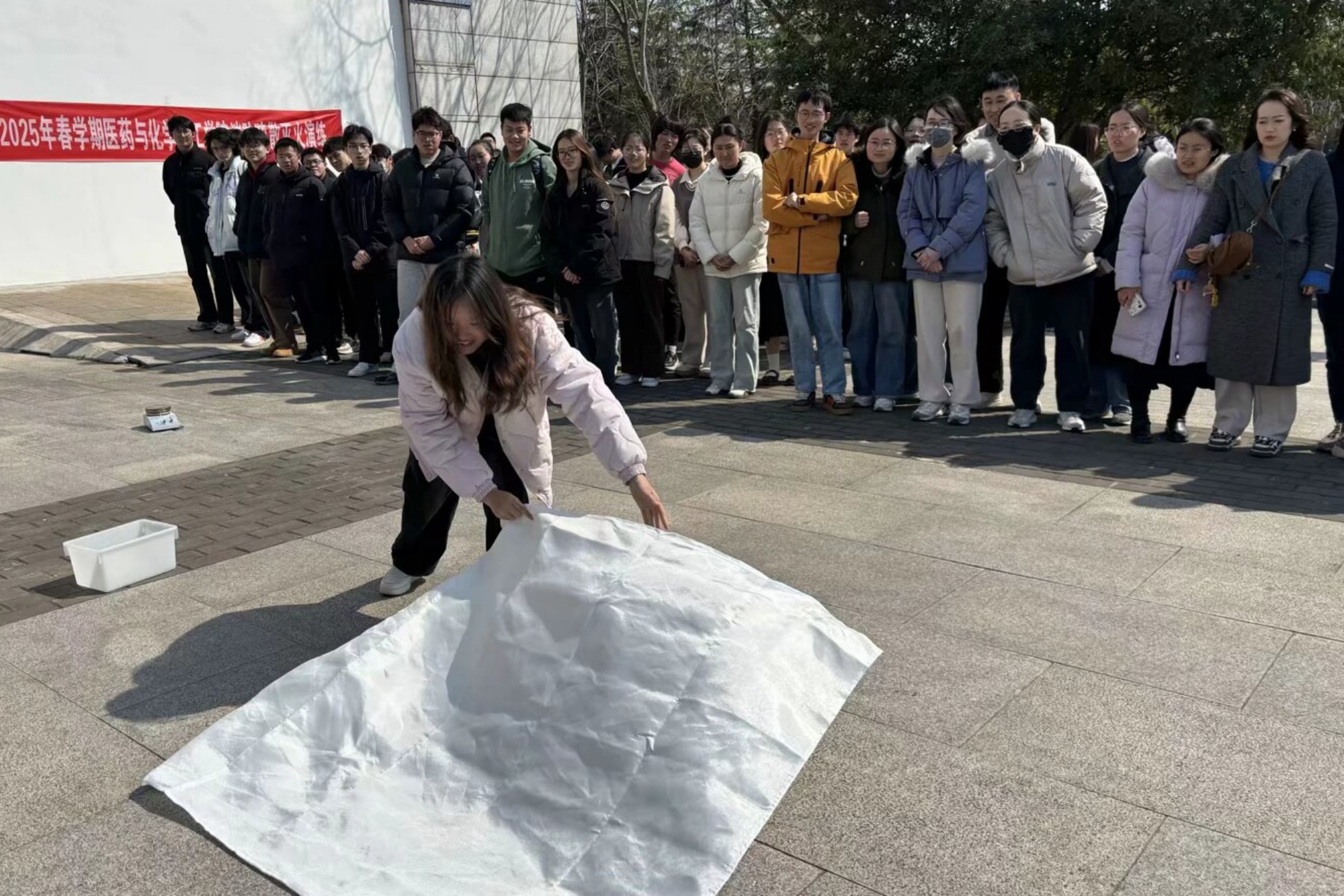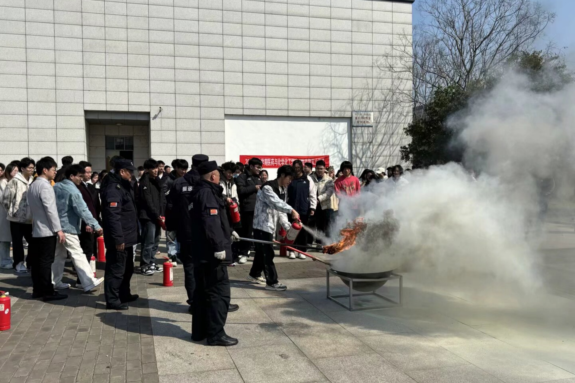 为进一步强化师生实验室安全意识,提升突发事件应急处置能力,3月19日下午,医药与化学化工学院联合学校保卫处在实验楼2区西广场举办实验室消防安全应急演练。学院党总支书记朱诚、院长助理王豪、实验中心教师、师生代表近百人参与活动。