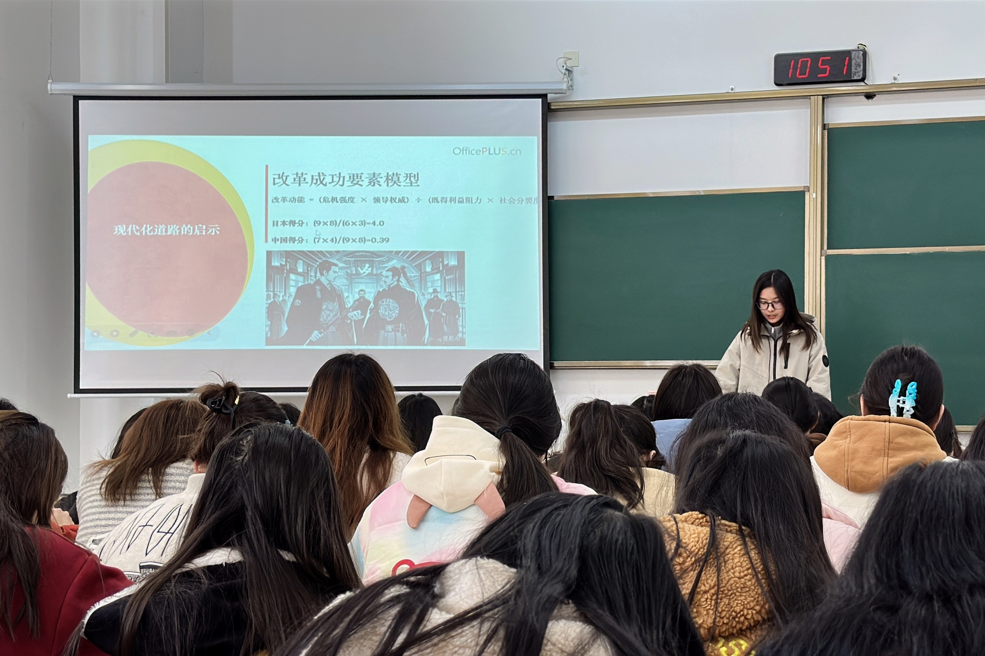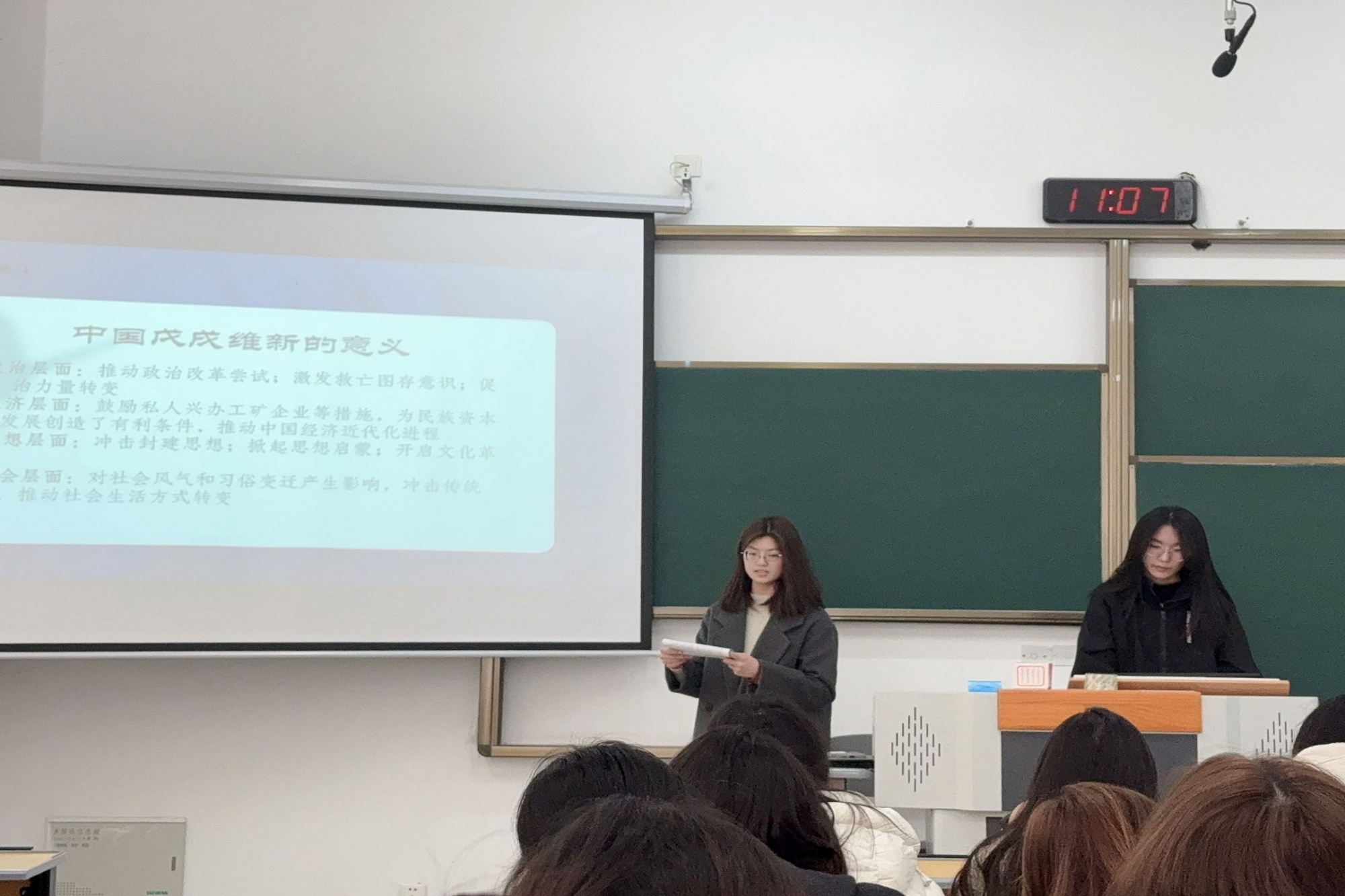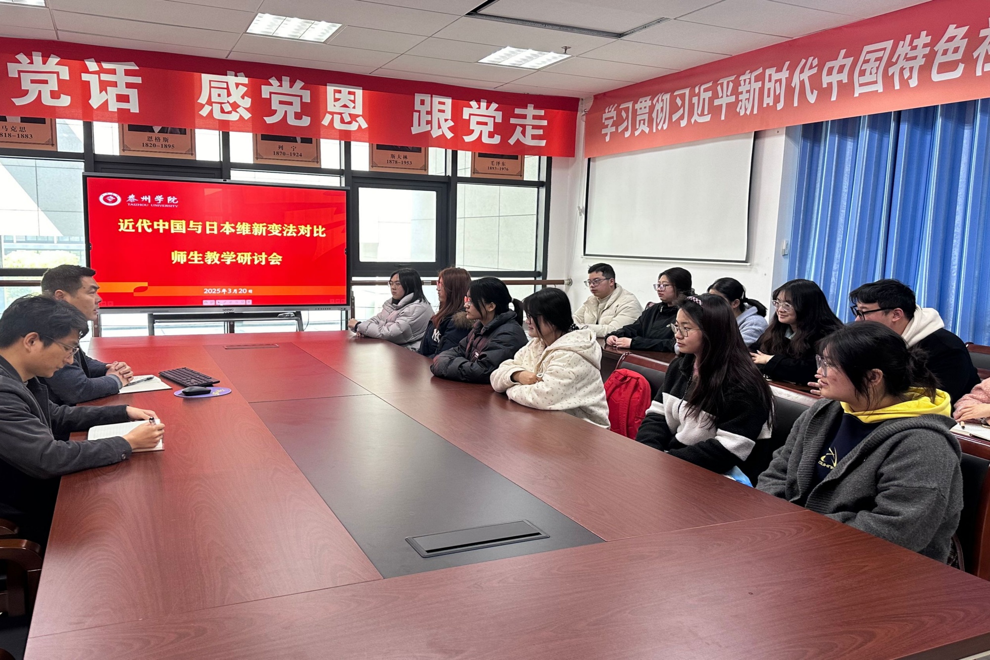 多场域融合,拓展思政教育新空间。此次教学活动创新性地突破传统课堂边界,将马克思主义学院会议室、思政课堂教室、多媒体教室和学生宿舍等多个场地有机结合。在会议室,教师团队精心筹备,青年马克思主义研究会成员深度参与,为活动注入新鲜活力;思政课堂教室内,传统与现代教学手段相互交融,教师讲解和学生分享双向互动;在多媒体教室和学生宿舍,同学们聚精会神,观看《大国崛起》系列纪录片之《百年维新》,又与《中国近现代史纲要》课本相结合,研读维新运动的兴起和夭折。