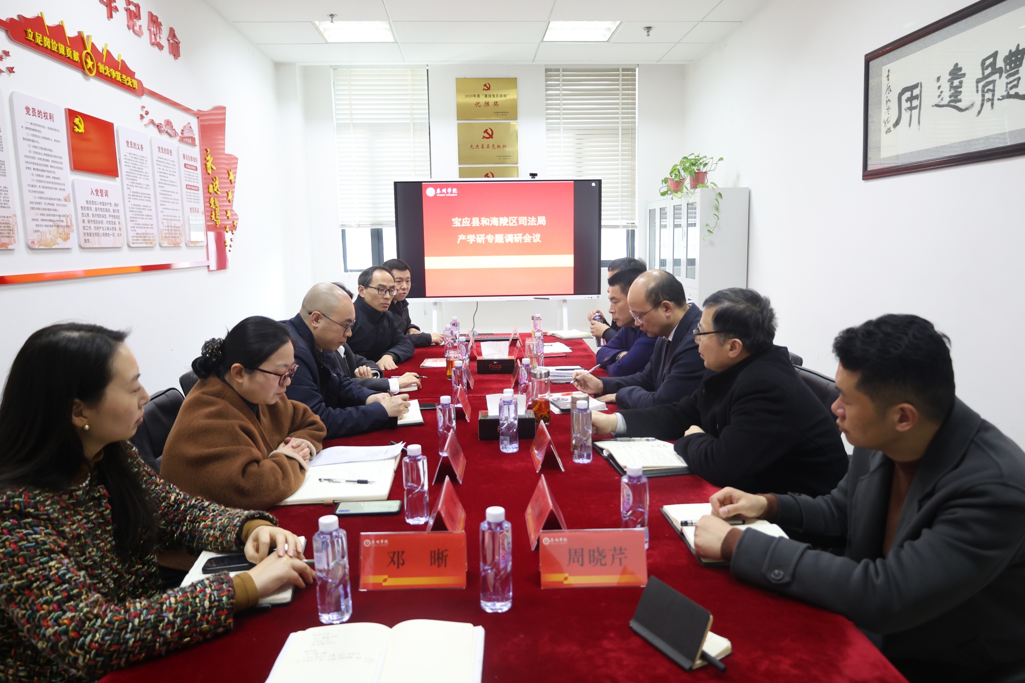 3月21日下午,人文学院与扬州市宝应县司法局和泰州市海陵区司法局在明达楼D1414召开产学研专题调研会议。宝应县司法局局长王萌、海陵区司法局副局长杨成荣及科室负责人、宝胜科创法务部部长蔡济华、人文学院领导班子、法学系骨干教师、知识产权专业班主任等共14人参加会议,会议由人文学院党总支书记吴小荣主持。