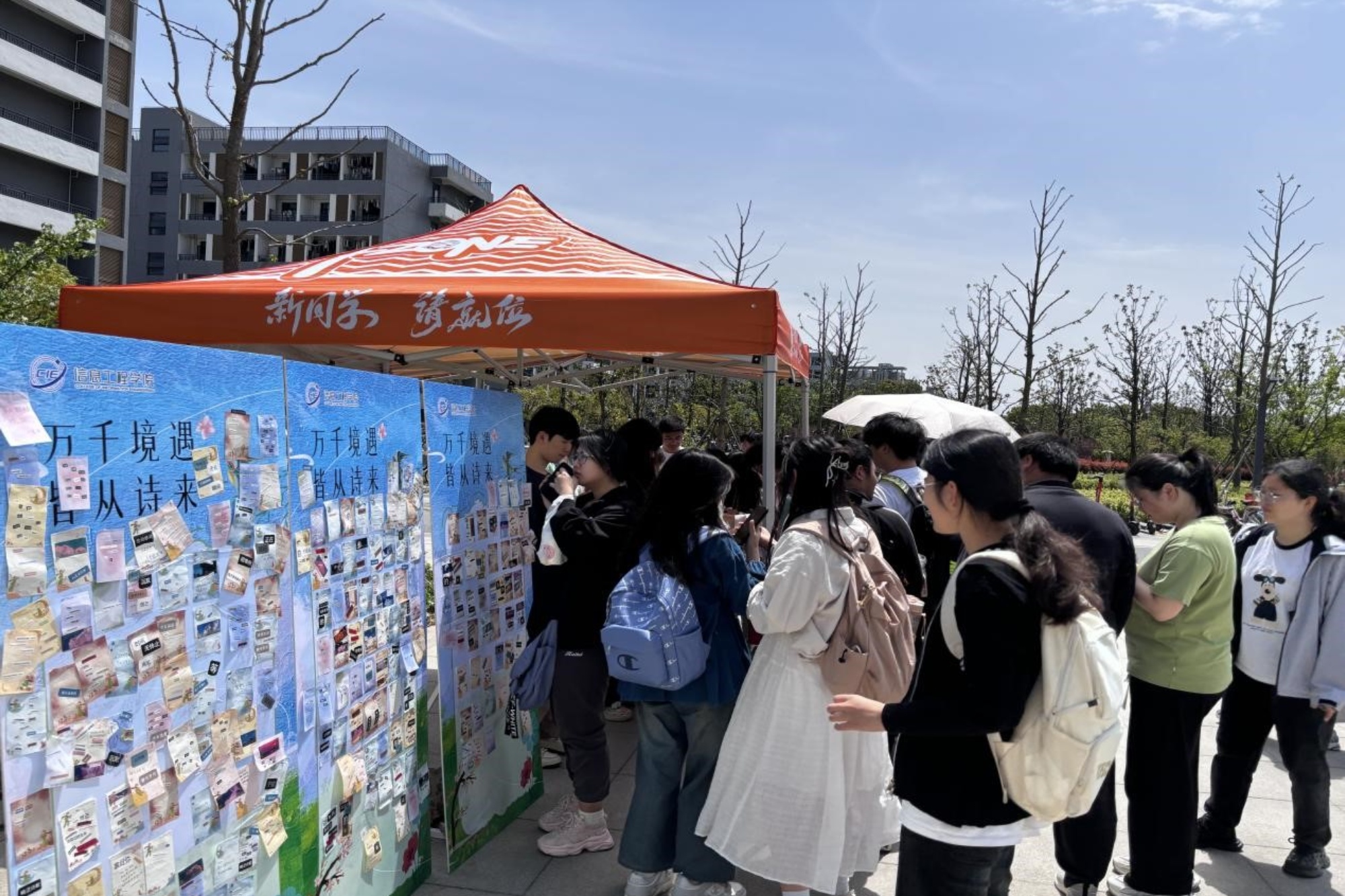 为丰富学生课余生活,营造诗意校园文化氛围,4月22日至23日,信息工程学院在新食堂旁广场举办了为期两天的“万千境遇,皆从诗来”春日贴诗活动。活动以创意互动形式吸引了全校近千名学子踊跃参与,成为春日校园里一道独特的文化风景。