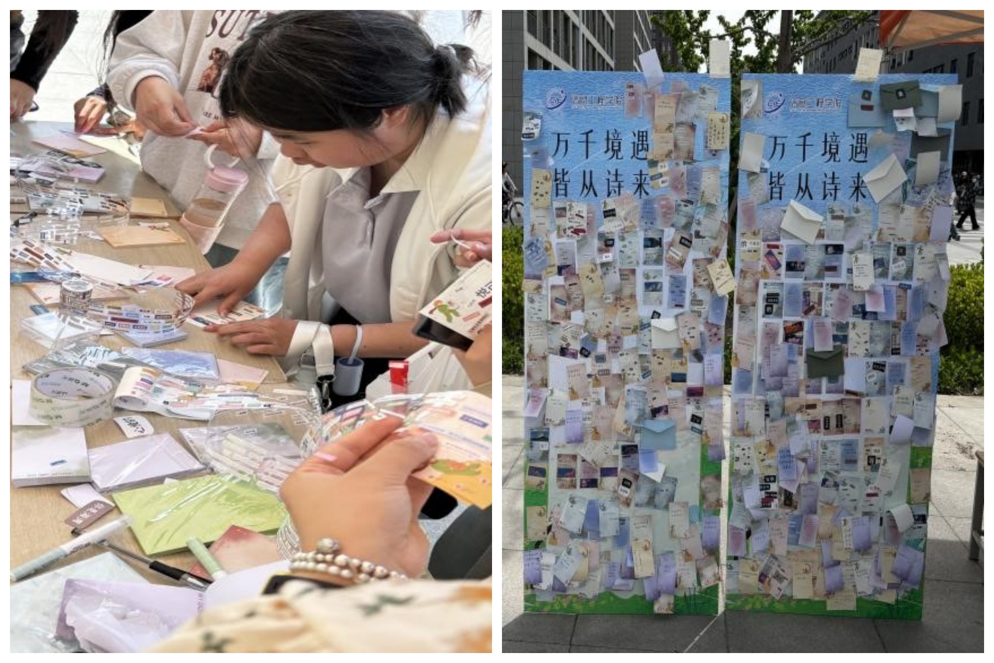 活动现场分为“春日贴诗墙”与“诗意漂流信”两大互动区域。在“春日贴诗墙”互动区,参与者可以用文字贴纸和短句贴纸,在“贴诗墙”上摘录自己喜欢的古今诗句,或者自由拼接原创短句,在轻松创作中释放压力、表达心情。在“诗意漂流信”区域,参与者既可随机抽取陌生同学的信笺,感受字里行间的心绪流动,也可执笔书写自己的心情故事,让情感在匿名交流中悄然传递。