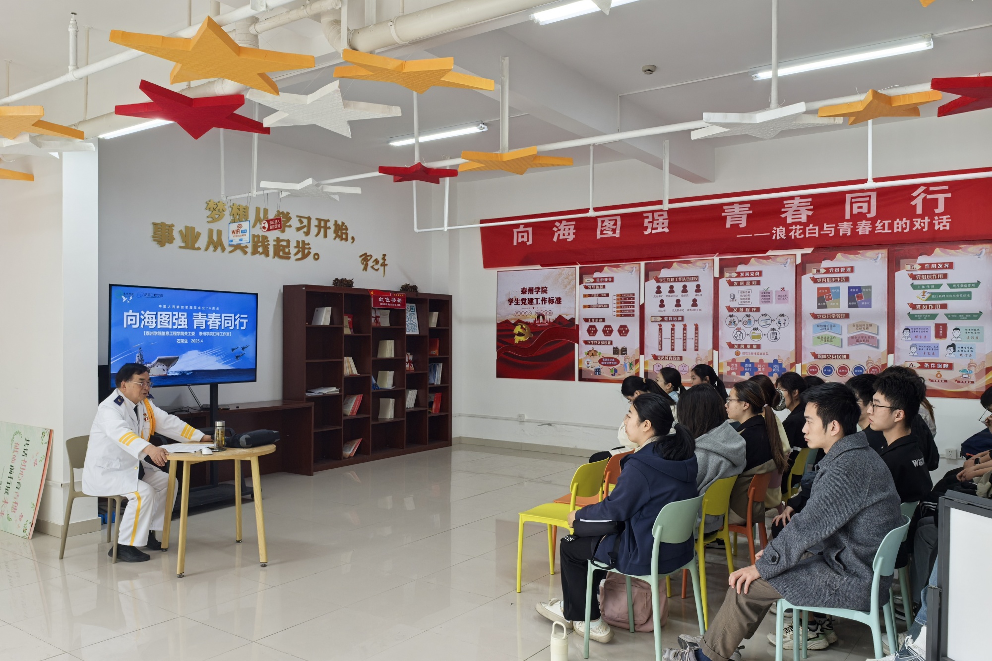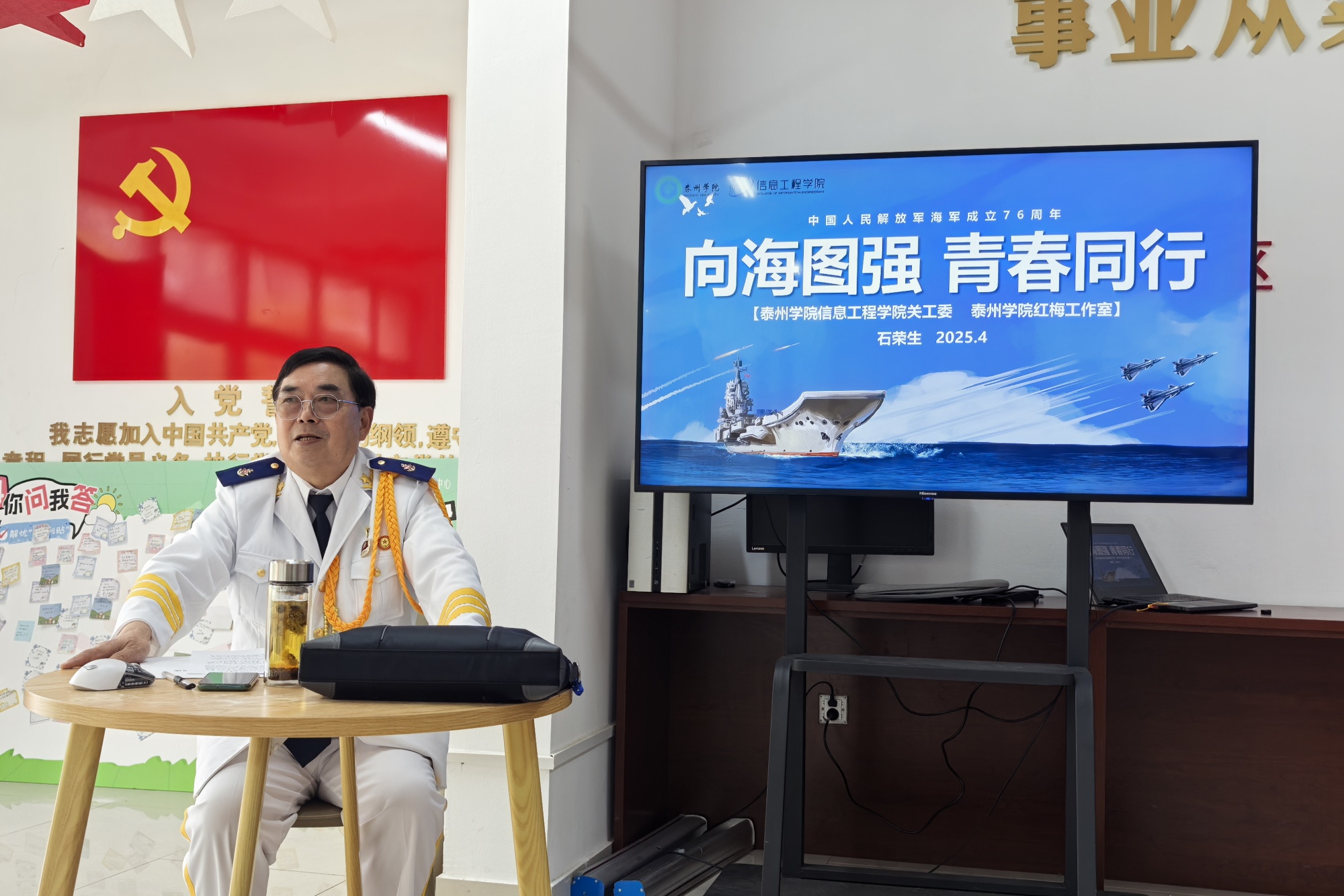 4月22日,为庆祝中国人民解放军海军成立76周年,深化国防教育,信息工程学院、红梅辅导员工作室在学校一站式服务中心举行“向海图强 青春同行”主题宣讲会。活动邀请服役16年的退役海军军官石荣生担任主讲。