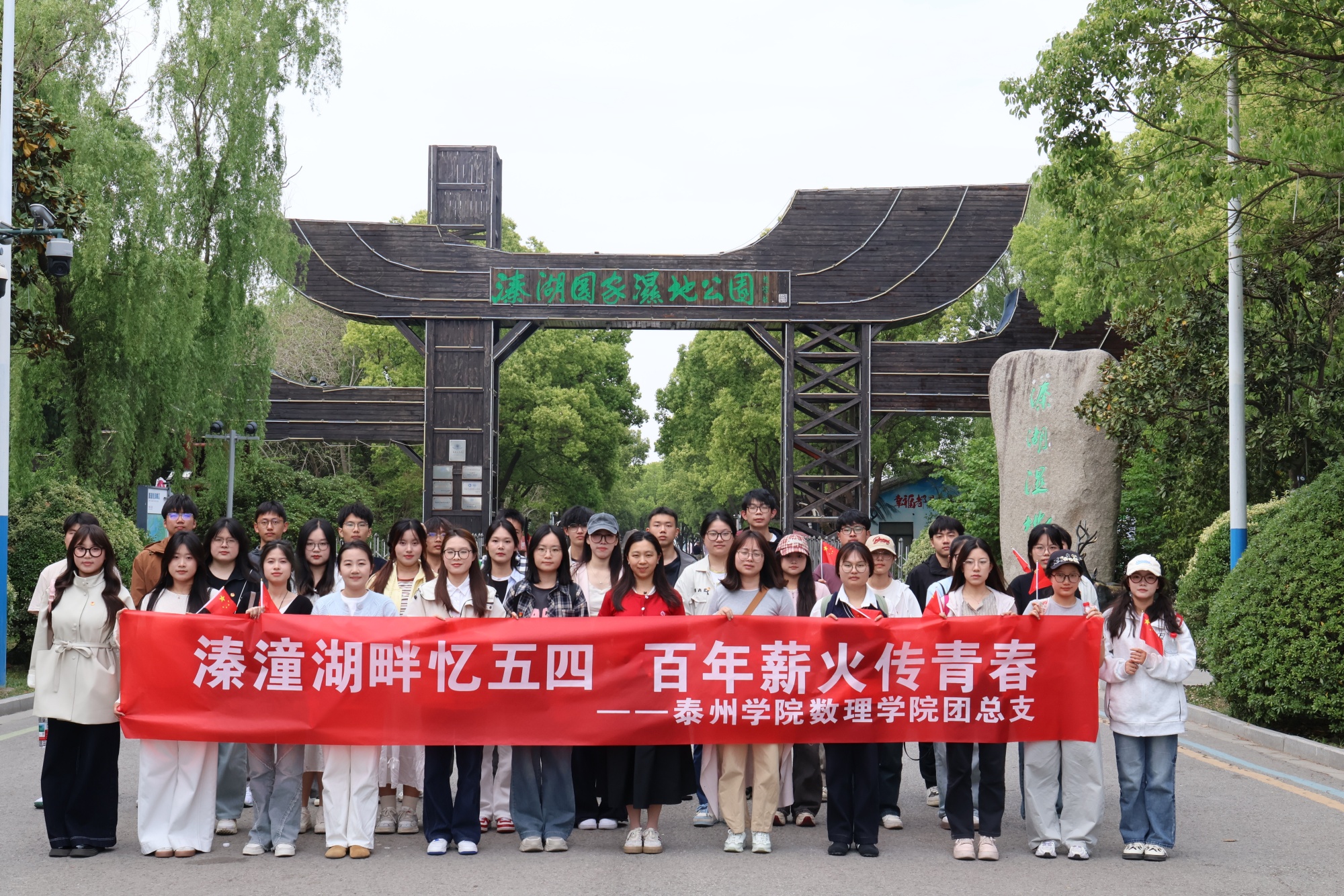 在溱潼,微风轻拂湖面,泛起粼粼波光,在这如画的美景中,同学们整齐列队,齐声高唱团歌。“我们是五月的花海,用青春拥抱时代……”嘹亮的歌声回荡在溱潼湖畔,唱出了同学们对共青团的无限热爱,更彰显着他们坚定的青春信念与勇于担当的精神风貌。团员代表马蓉蓉化身“生态讲解员”,围绕溱湖湿地丰富的资源和深厚的历史底蕴,向同学们展开系统讲解。她详细阐述了溱湖湿地在调节气候、净化水质、生物多样性保护等方面发挥的重要功能。从候鸟迁徙的生态链到湿地植物的净水原理,从古老的溱潼文化到现代生态保护的意义,同学们认真聆听,不时提问交流,在深入学习中,对湿地生态系统的重要性有了全面的认知,也更加明白了保护生态环境的责任之重。