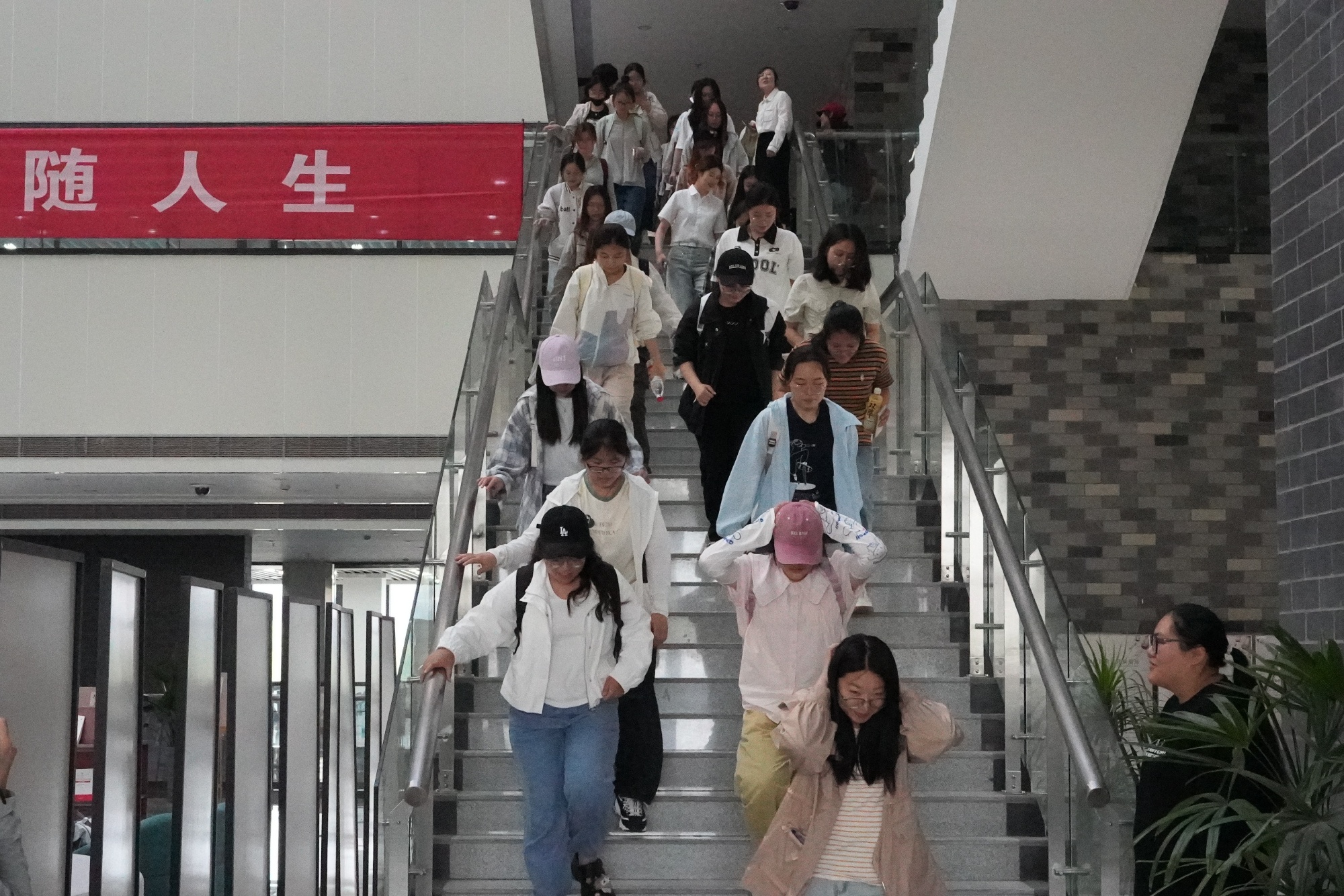 下午四点半,随着急促的地震预警警报声响起,演练正式开始。参演学生迅速就近躲避在阅览桌下或墙角等坚固物体旁,模拟地震灾害发生时的紧急避险行为。随着强烈地震暂时停止,利用地震余波暂未发生的空隙,地震预警警报声再次响起,图书馆二楼和三楼的学生迅速按预定的疏散路线快速、有序地撤离至图书馆北广场,整个过程有条不紊。