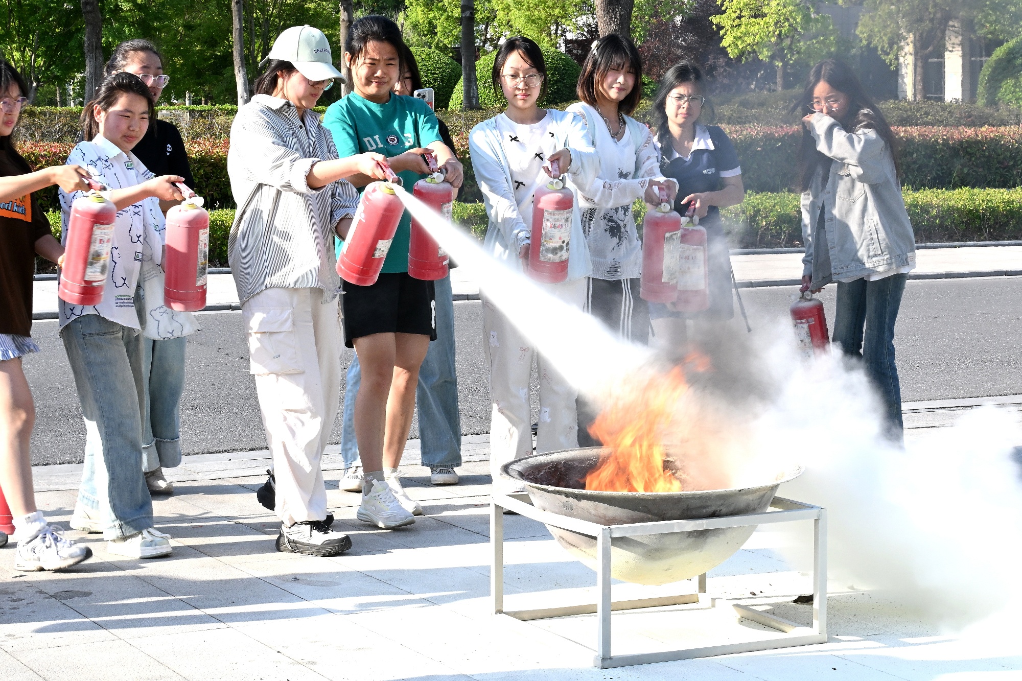 保卫处消防科科长陈小波讲解了常见消防设施的种类和灭火器的使用方法,十几名学生、高教后勤员工、保安代表进行了油盆灭火实战演练。