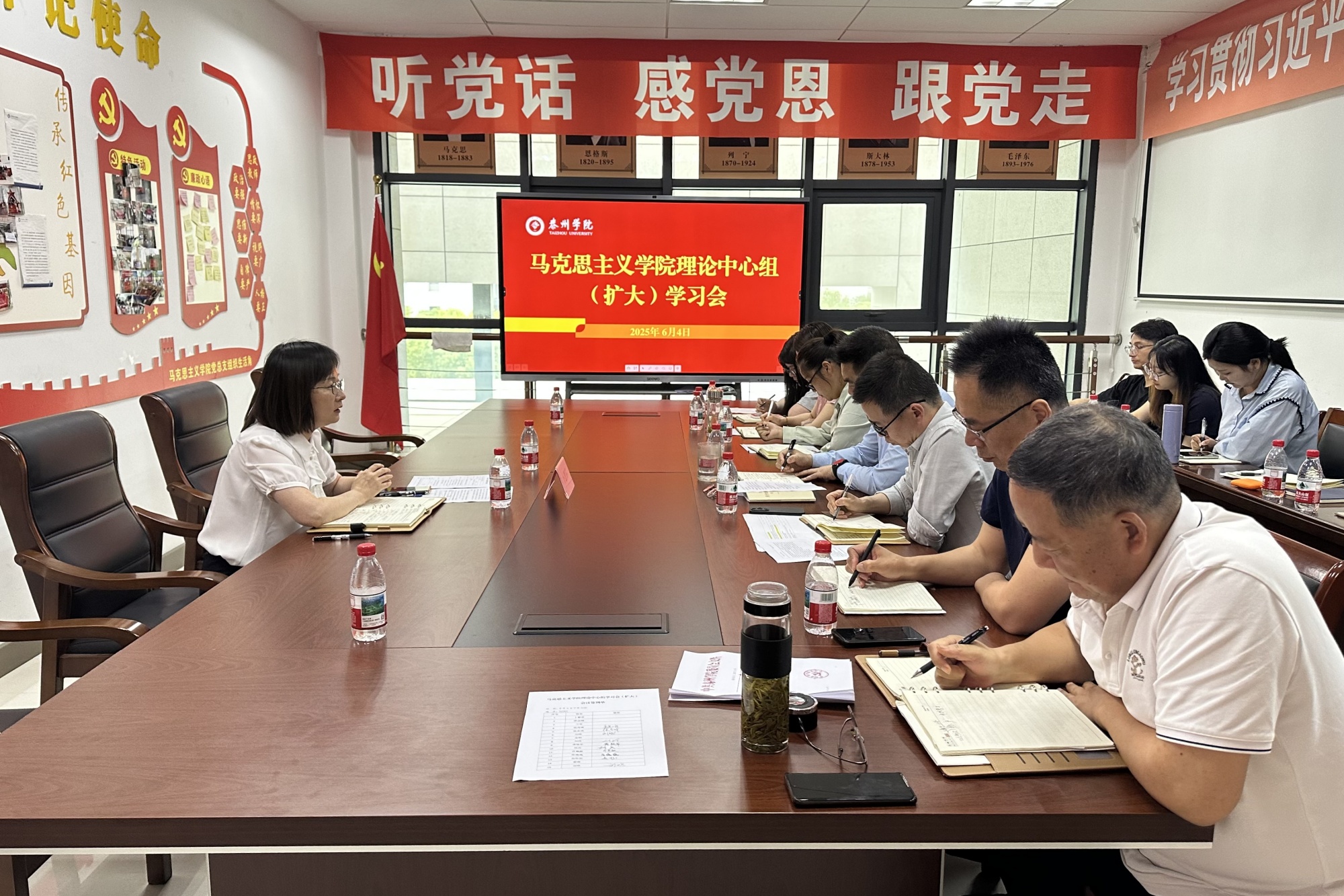 为深入贯彻落实党的二十大精神,扎实推进思政课建设专项巡视整改工作,6月4日下午,马克思主义学院党总支在明达楼D2301会议室召开理论学习中心组(扩大)学习会议,校党委常委、副校长卜慧芬列席旁听。马克思主义学院党政领导班子、党总支委员、党支部书记、教研室主任、党务秘书参加学习。会议由学院党总支书记陈志峰主持。