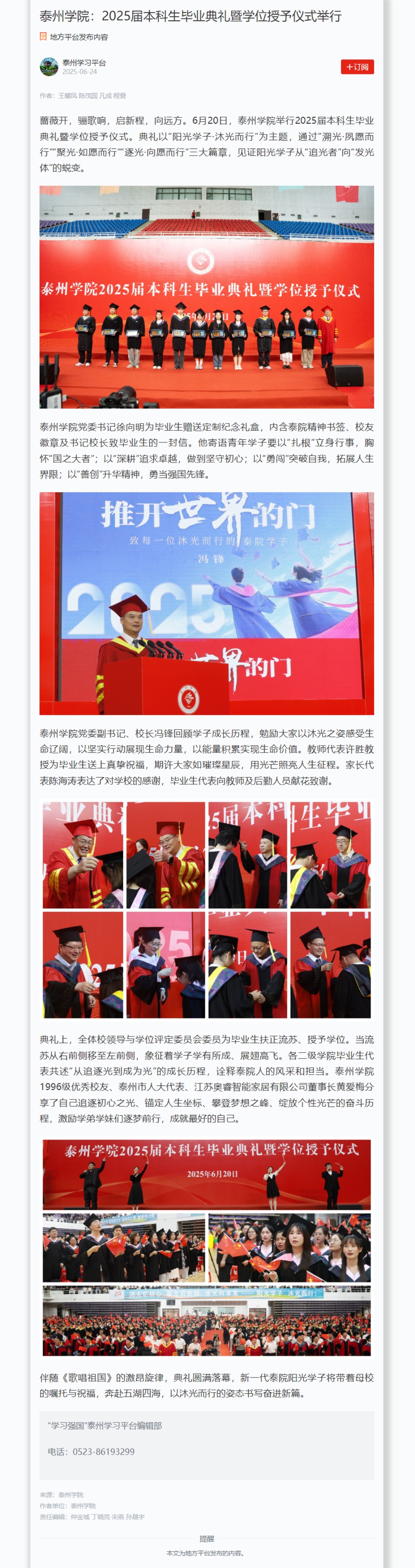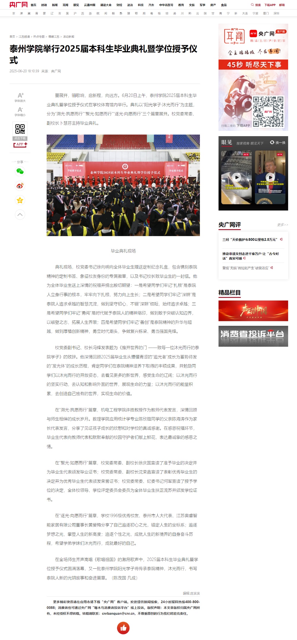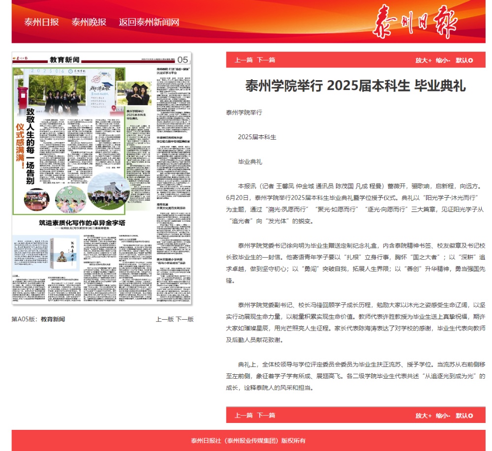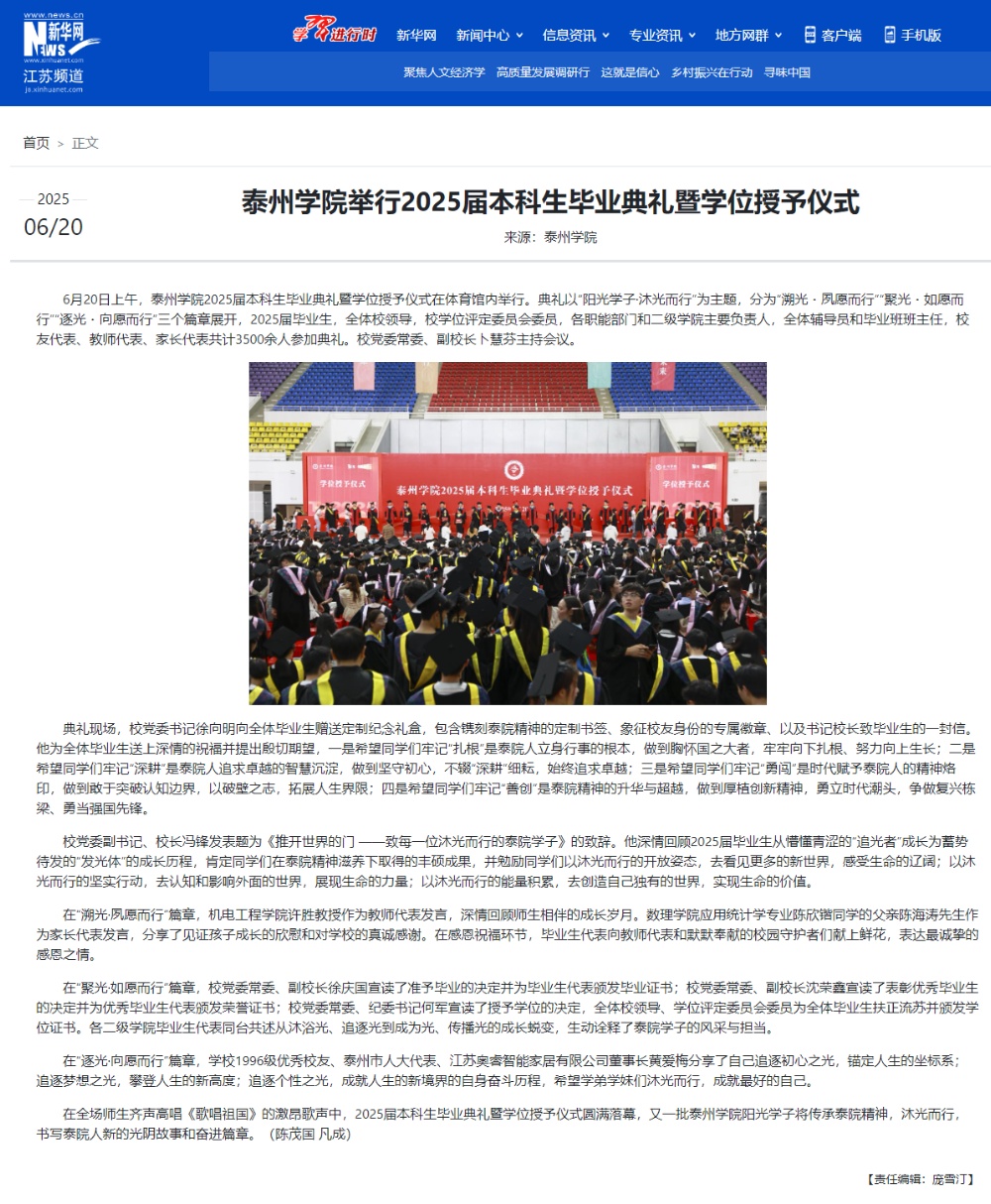 《央广网》《新华网》《现代快报》《学习强国》《泰州日报》等媒体近期报道bat3652025届本科生毕业典礼暨学位授予仪式