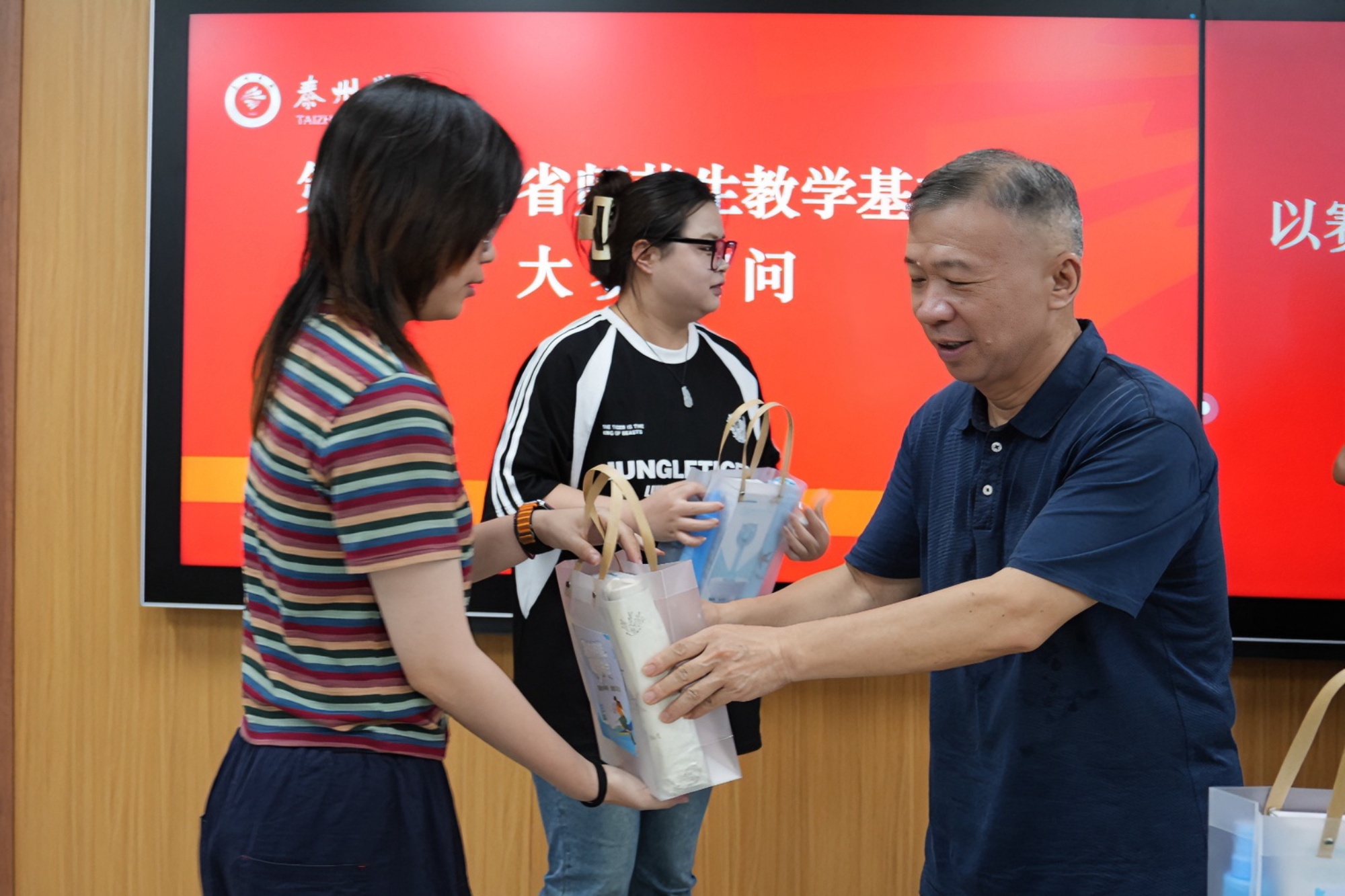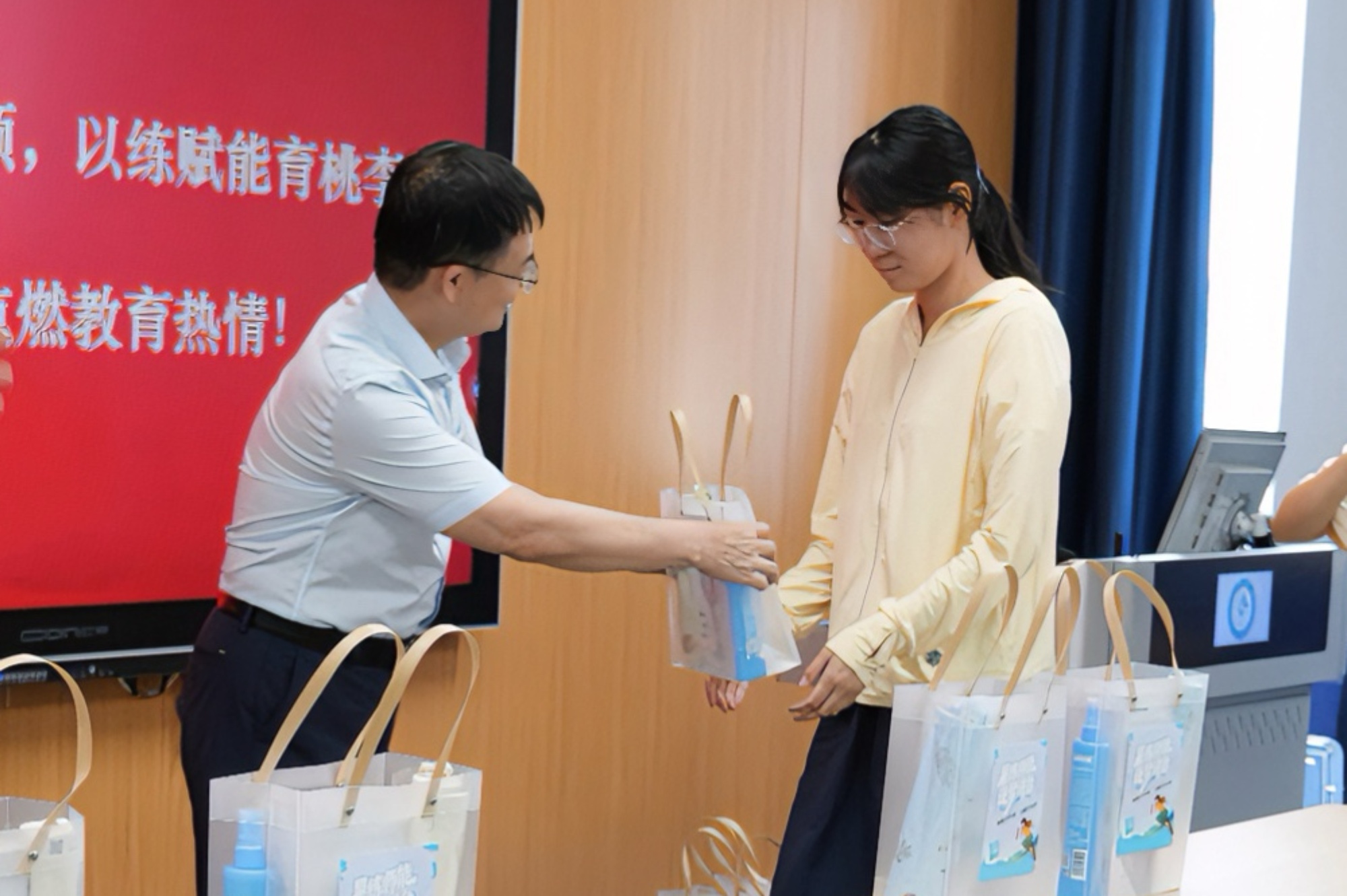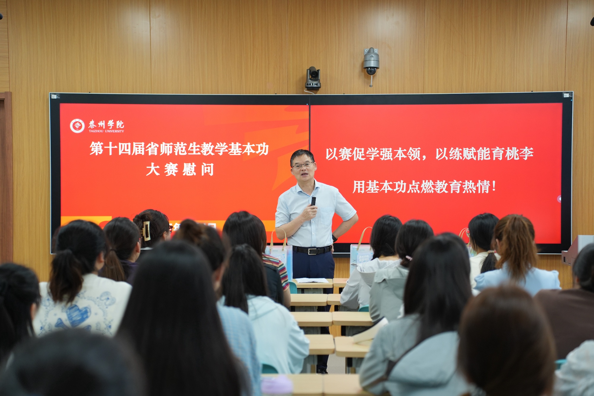 7月4日,校党委副书记、校长冯锋,校党委常委、副校长徐庆国走进第十四届省师范生教学基本功大赛集训教室,看望慰问参加集训的师范生选手,并发放慰问品。