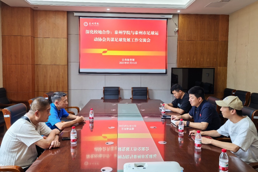 7月15日下午,泰州市足球协会与bat365公共体育部在二适楼会议室C1119举行座谈会,聚焦深化“三融三促”战略部署,推动校城共建合作,共商泰州足球人才协同培养。市足协秘书长王小平、青训部主任张剑,学校公共体育部主任赵益鑫等出席会议。