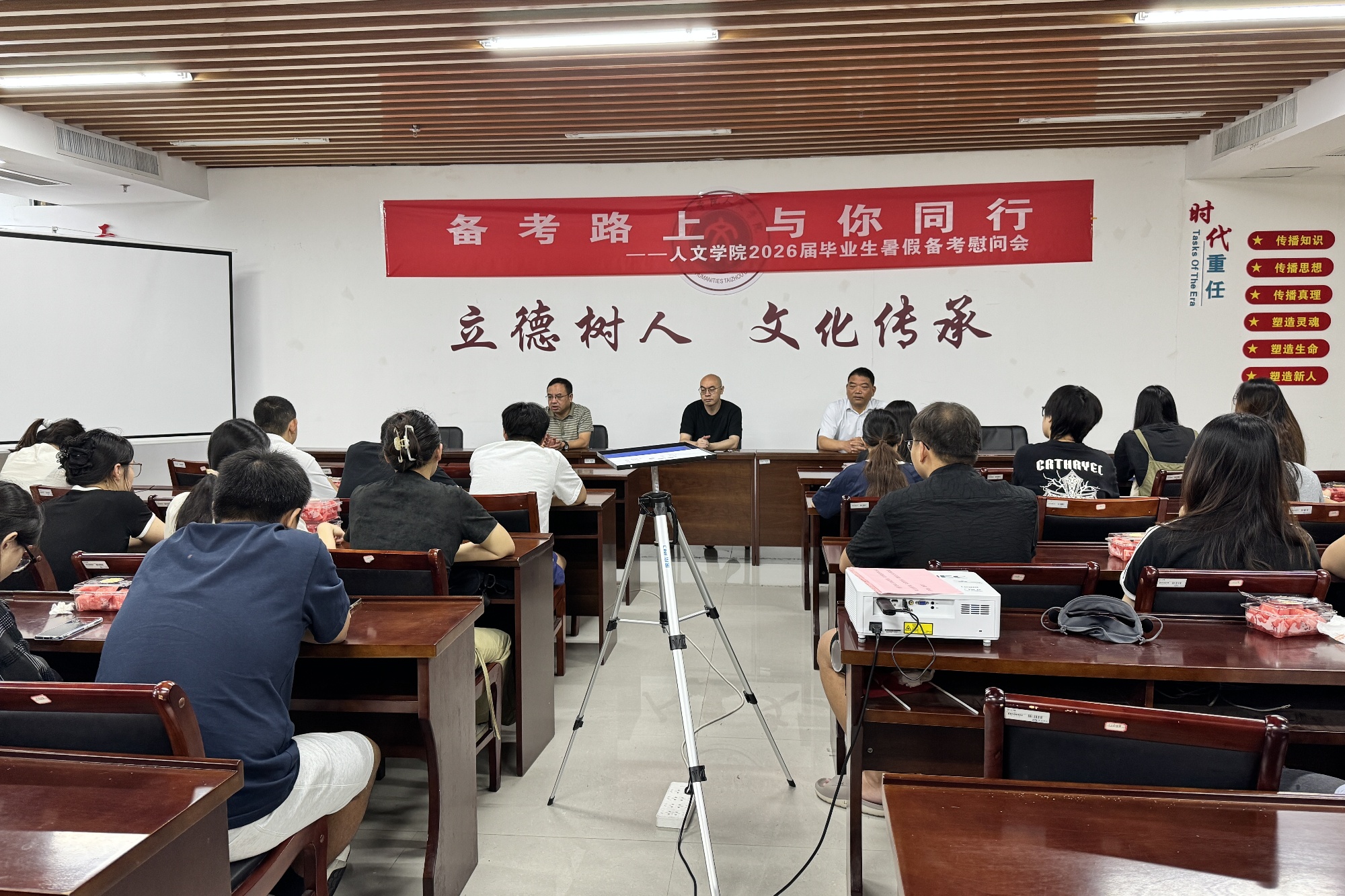 7月30日上午,人文学院举办考研慰问座谈会。学院党总支书记吴小荣、院长钱成、年级辅导员及留校备考学生参加活动。