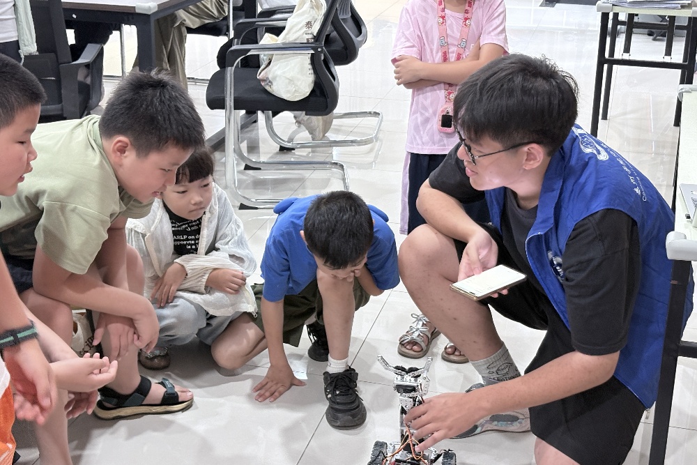 活动还设置了演示与实操环节,孩子们不仅亲眼看见智能小车运行,更在成员指导下亲自操控,体验编程指令如何指挥小车完成前进、转向等动作,初探编程的奇妙世界。实践团成员王宗纬在春景社区活动后深有感触:“孩子们天马行空的想法让我们惊喜,也鞭策我们未来要设计更丰富、更具启发性的科普课程。”