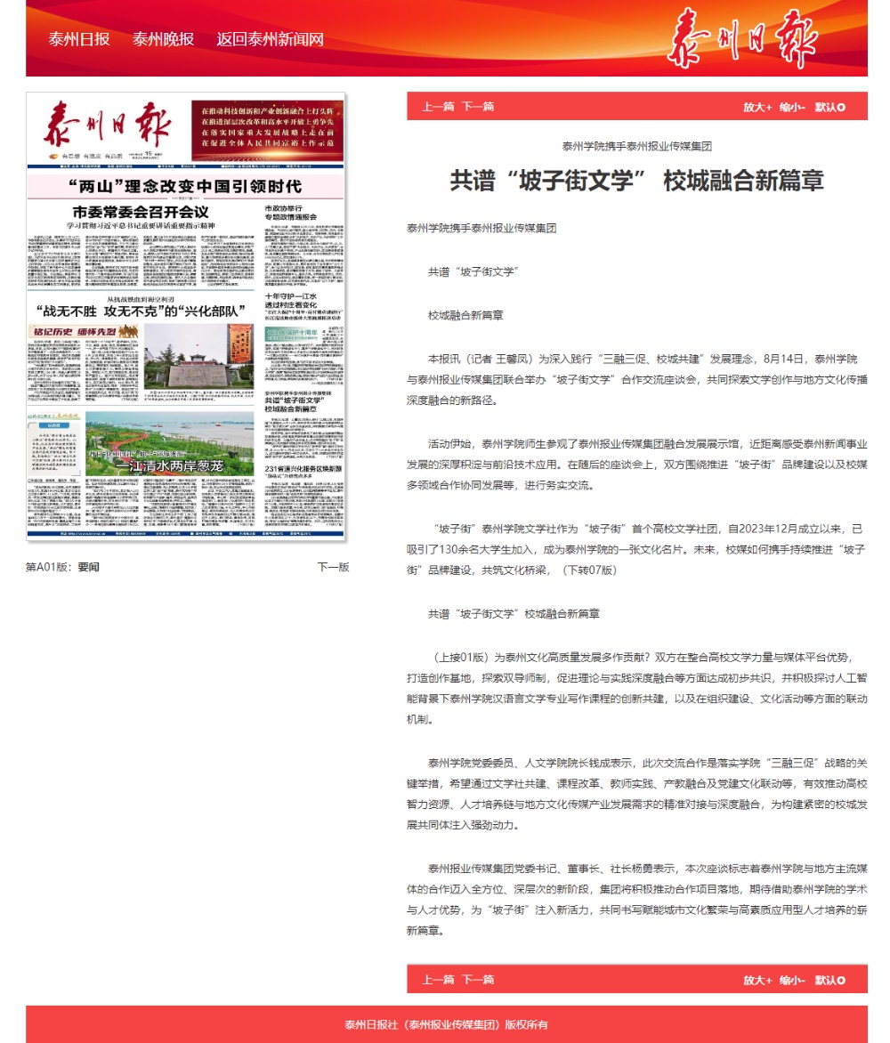 《泰州日报》《泰州晚报》2025年8月15日报道bat365携手泰州报业传媒集团共谱“坡子街文学” 校城融合新篇章