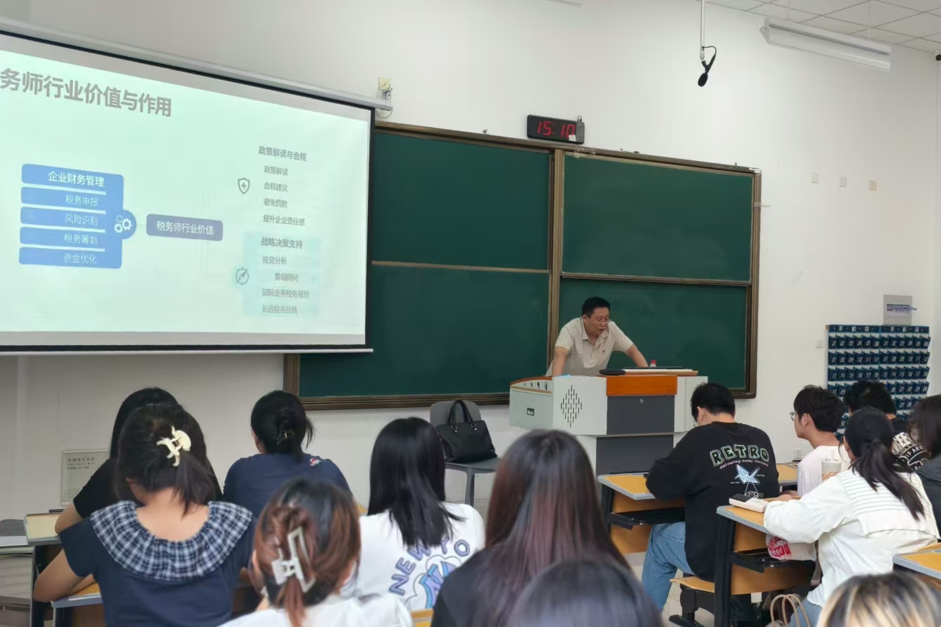 花忠明以丰富的行业实践为基础,从税务师的定义、发展历程、作用与价值、未来前景四个方面进行了系统讲解。他回顾了税务师制度从20世纪80年代税务代理人萌芽,到1996年《注册税务师资格制度暂行规定》发布,确立职业资格,再到2014年更名为“税务师”的发展历程,并穿插解读了与学生未来工作息息相关的税收政策与实务案例。花忠明指出,随着国家税收制度改革、税收征管数字化等进程加快,税务师在税收筹划、合规审查、风险防控等领域发挥着不可替代的作用,市场需求持续扩大,职业发展空间广阔。