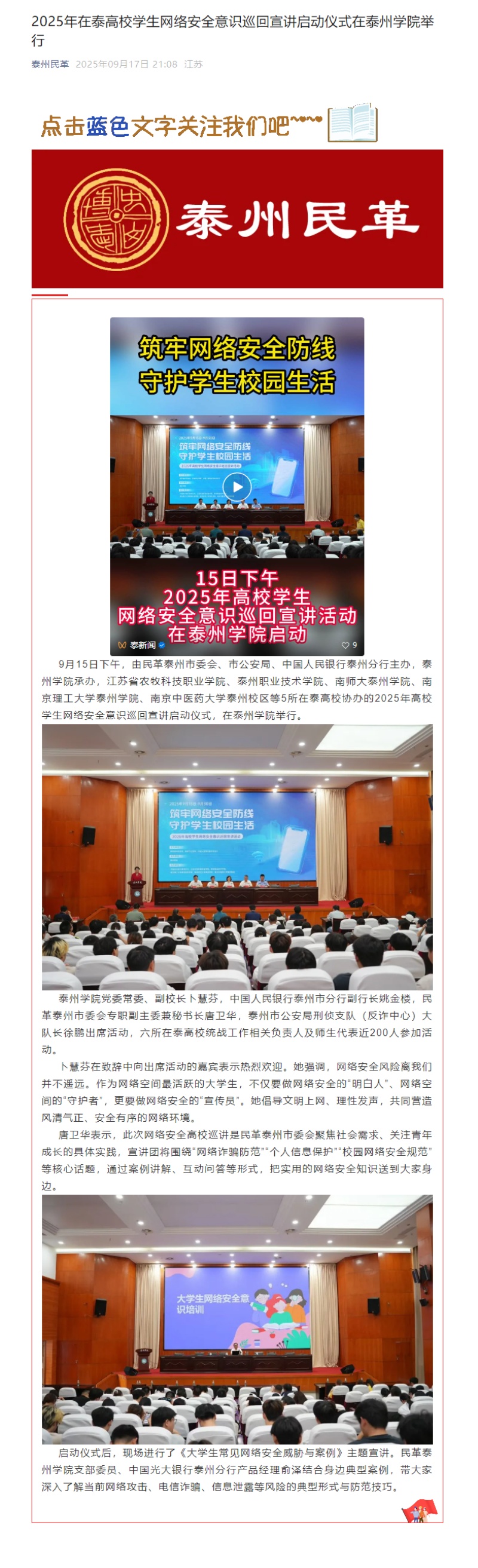 《泰州广播电视台》《泰州民革》2025年9月16日、17日报道2025年在泰高校学生网络安全意识巡回宣讲启动仪式在bat365举行