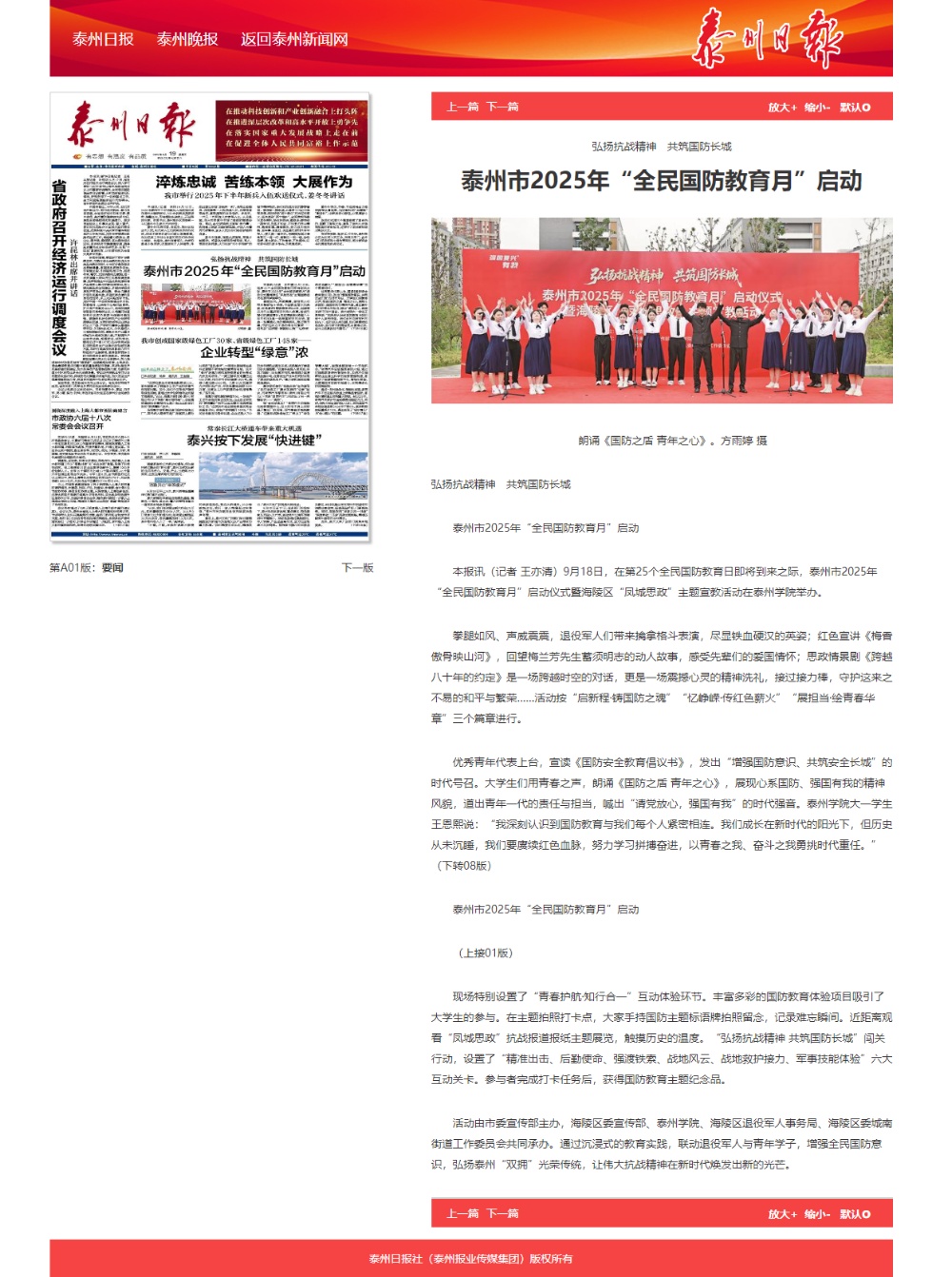 《泰州日报》2025年9月19日报道《弘扬抗战精神 共筑国防长城 泰州市2025年“全民国防教育月”启动》