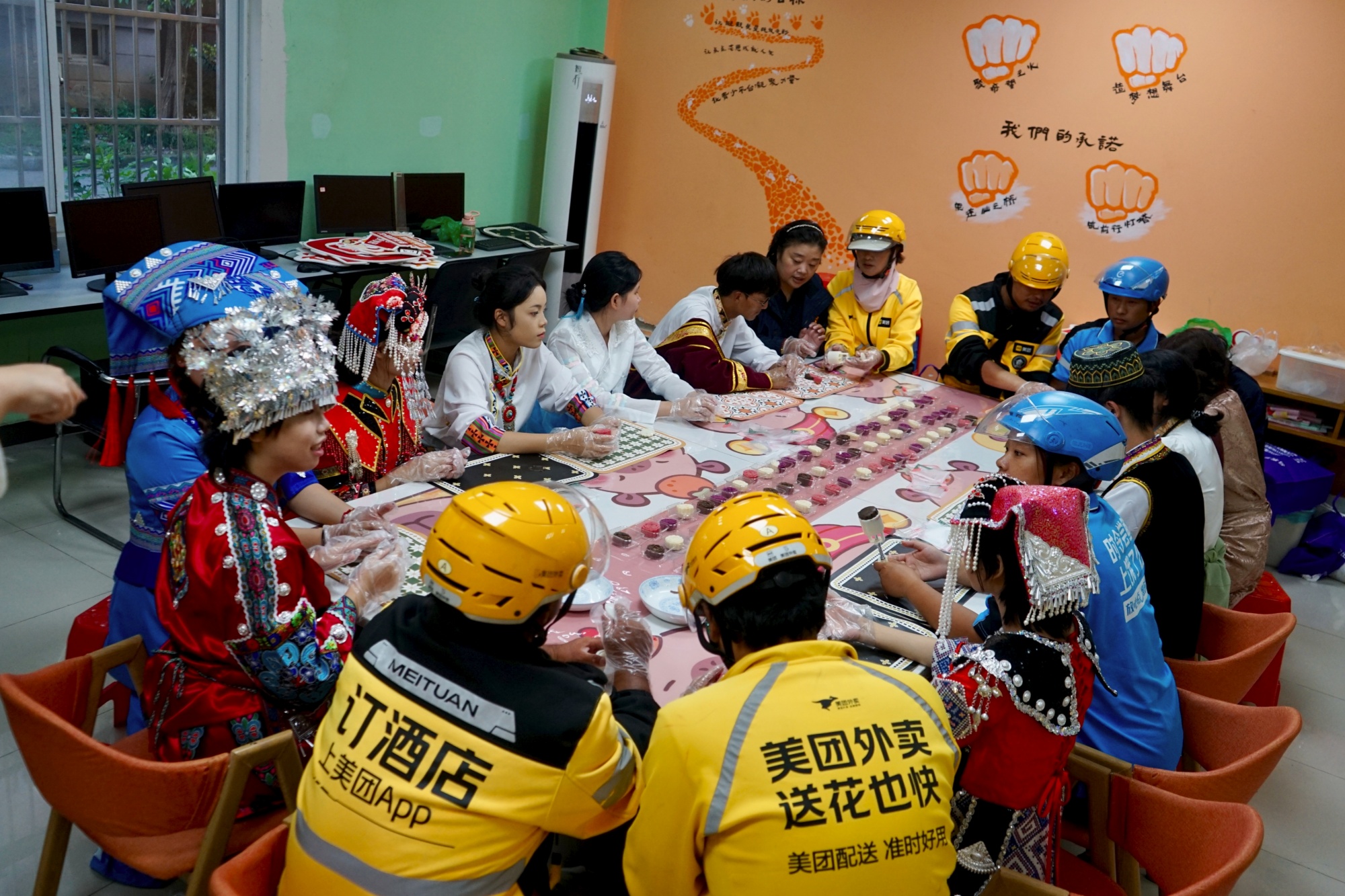 演出结束后,人文学院的学生代表与社会各界新就业群体共同做月饼,唠家常。