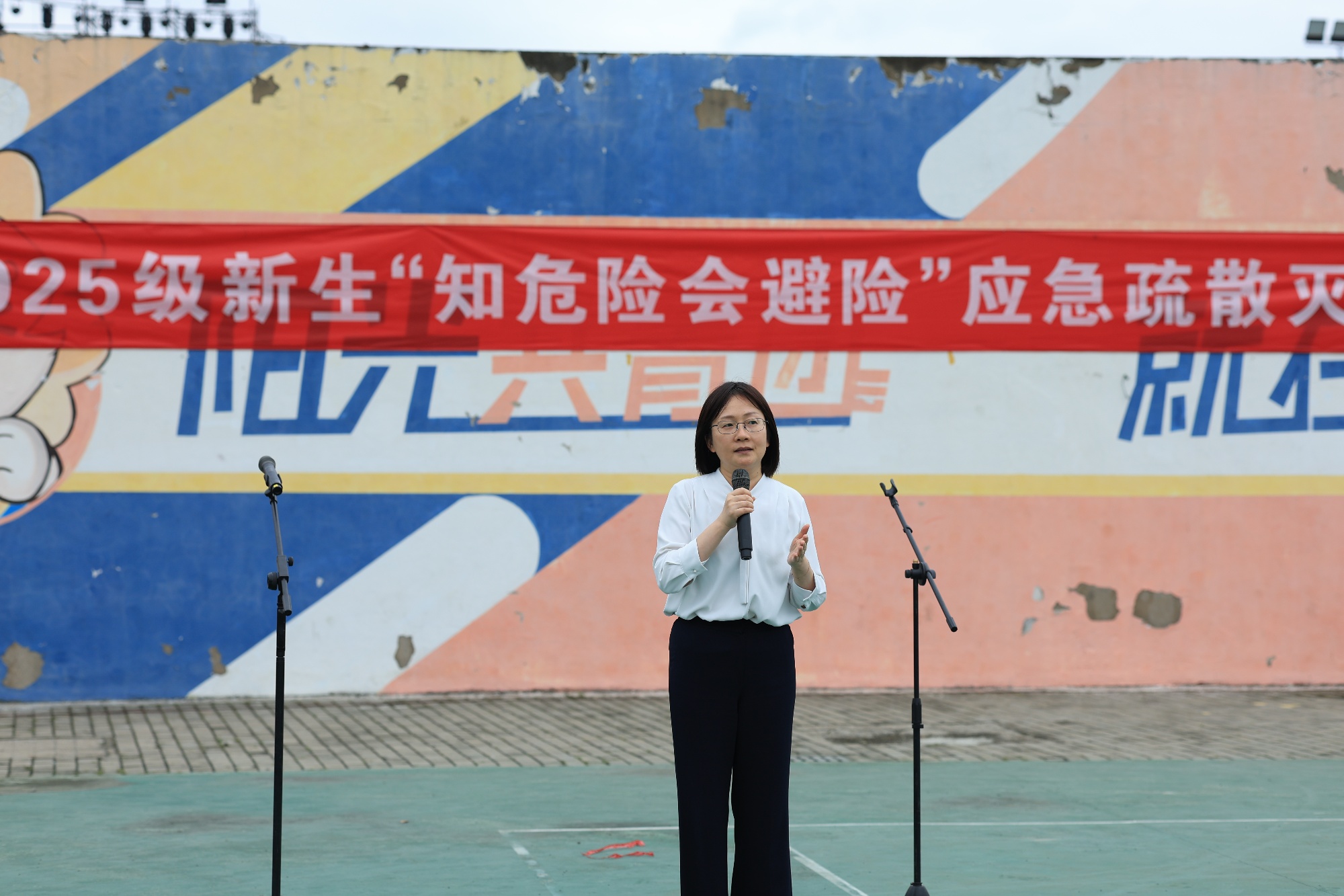 10月16日下午,bat365在篮球场举行2025级新生“知危险会避险”应急疏散灭火演练。校党委常委、副校长卜慧芬担任总指挥。保卫处、学工处、各二级学院相关负责人员现场组织演练活动的实施,2025级3600余名新生、新入职辅导员、高教后勤和学校食堂部分员工参加演练。
