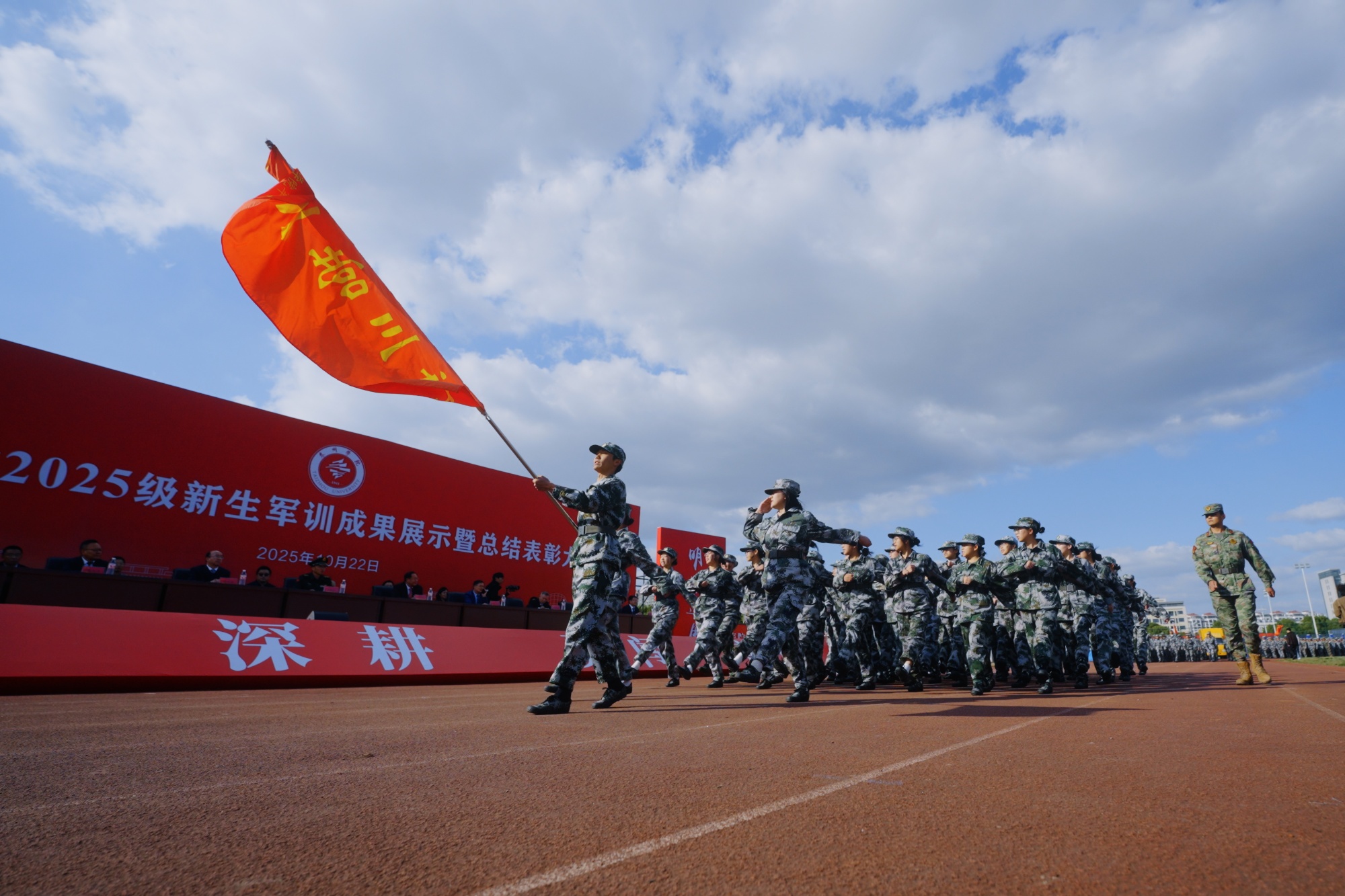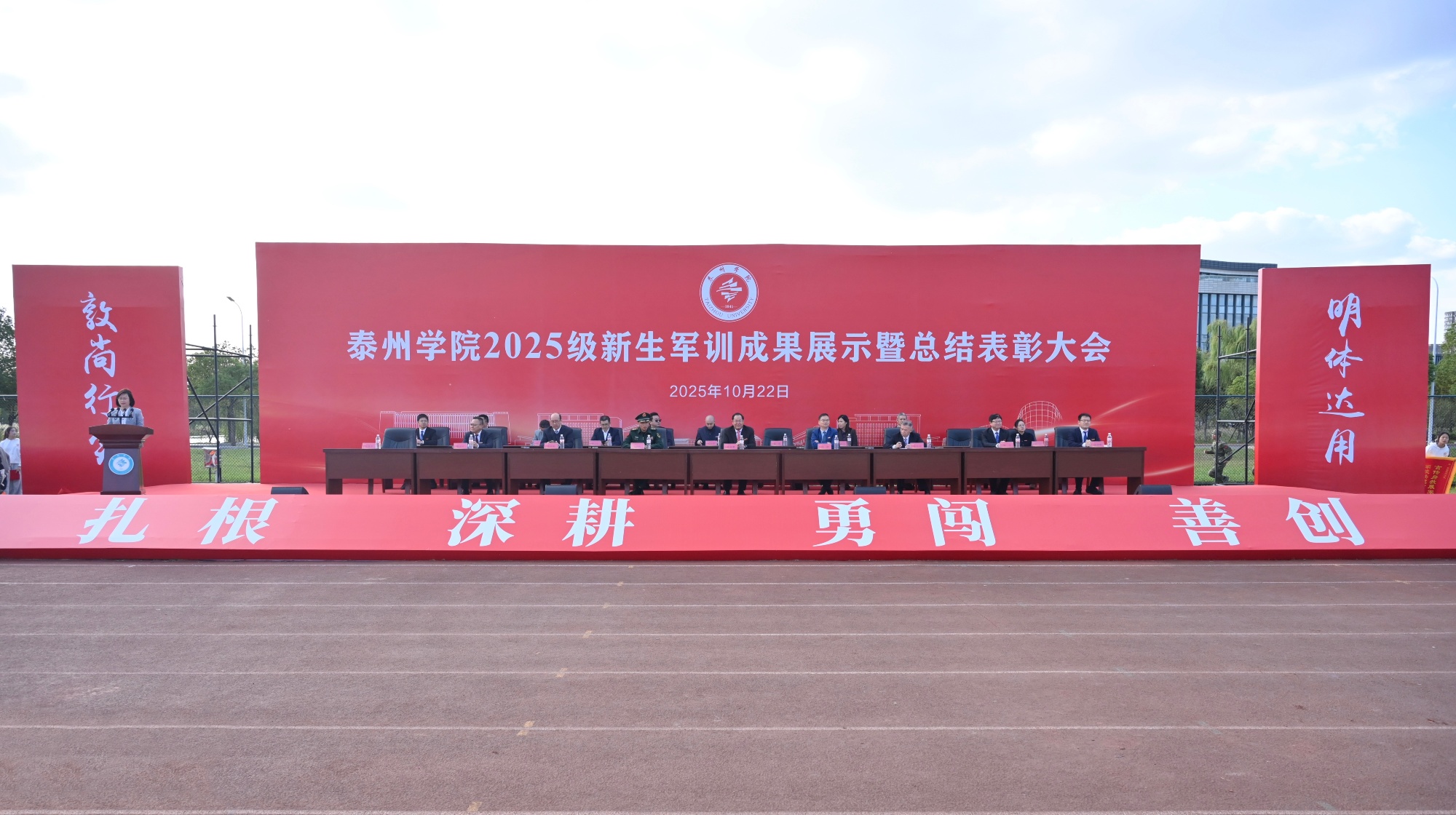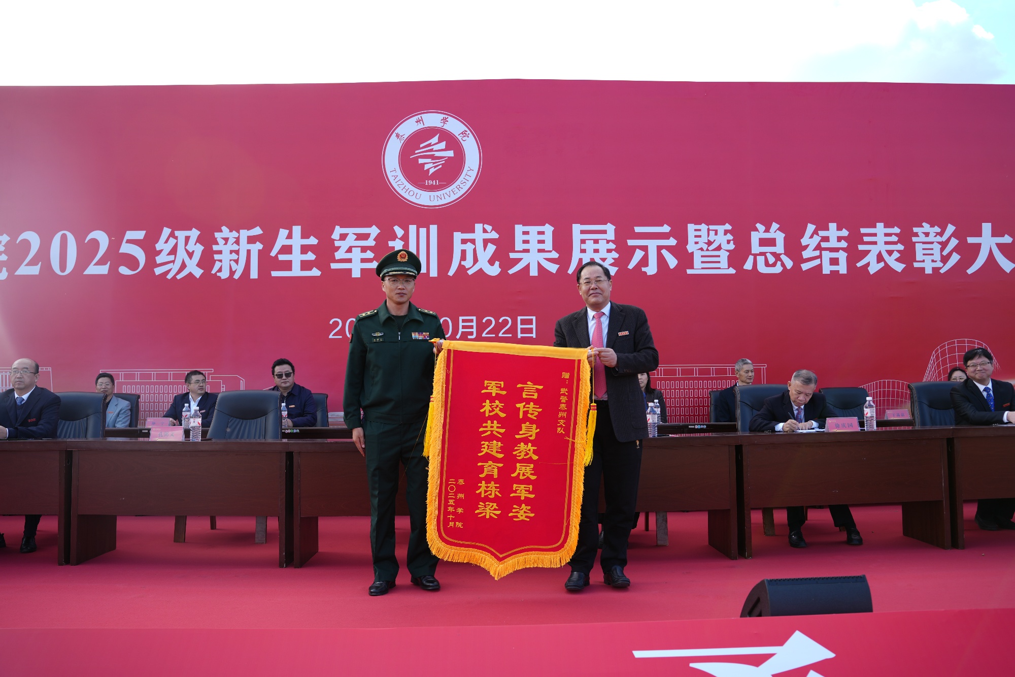 10月22日下午,bat365在线中国官网登录入口2025级新生军训成果展示暨总结表彰大会在运动场隆重举行。全体在泰校领导、武警泰州支队参谋长孔弼文、各二级学院相关负责人,军训带训教官,全体新生辅导员和2025级新生参加了大会。大会由校党委常委、副校长卜慧芬主持。