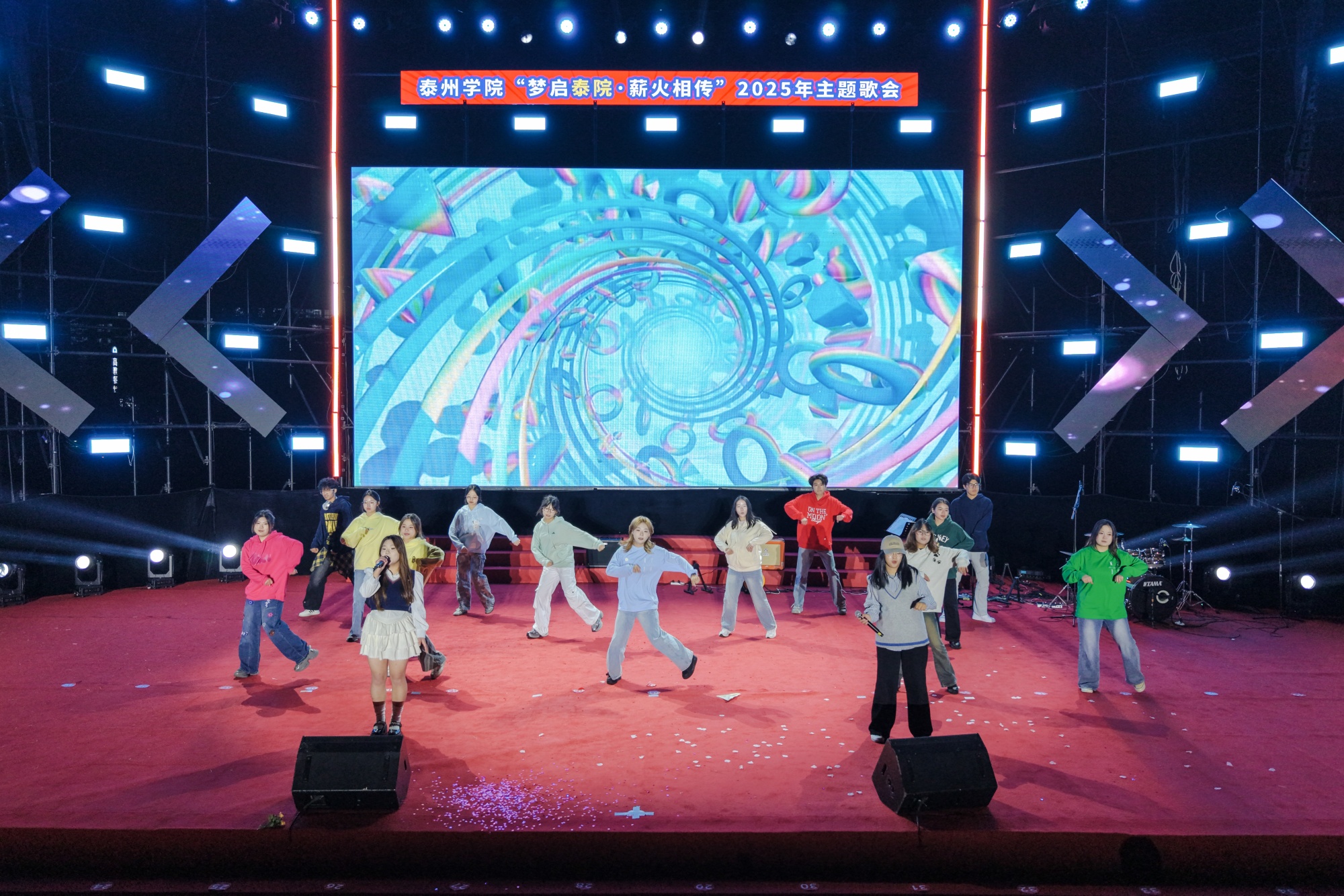 歌会主体演出环节精彩纷呈,师生同台尽显泰院风采。上半场以“师生联动”为主线,机关部门带来活力满满的歌曲联唱,各学院精心编排师生互动节目,用歌声与舞蹈传递对新生的欢迎、对校园的热爱;下半场聚焦“青春绽放”,泰院学子轮番登场,演唱、歌舞、走秀、乐队表演等多元形式精彩纷呈,展现出泰院青年的蓬勃朝气与艺术才华。趣味十足的抢麦环节更是点燃全场热情,学子们踊跃参与,镜头里的笑脸与欢呼声交织,汇成青春最美的乐章。歌会在《有我》的激昂旋律中圆满落幕,“青春有我,强国担当”的信念在师生心中深深扎根。