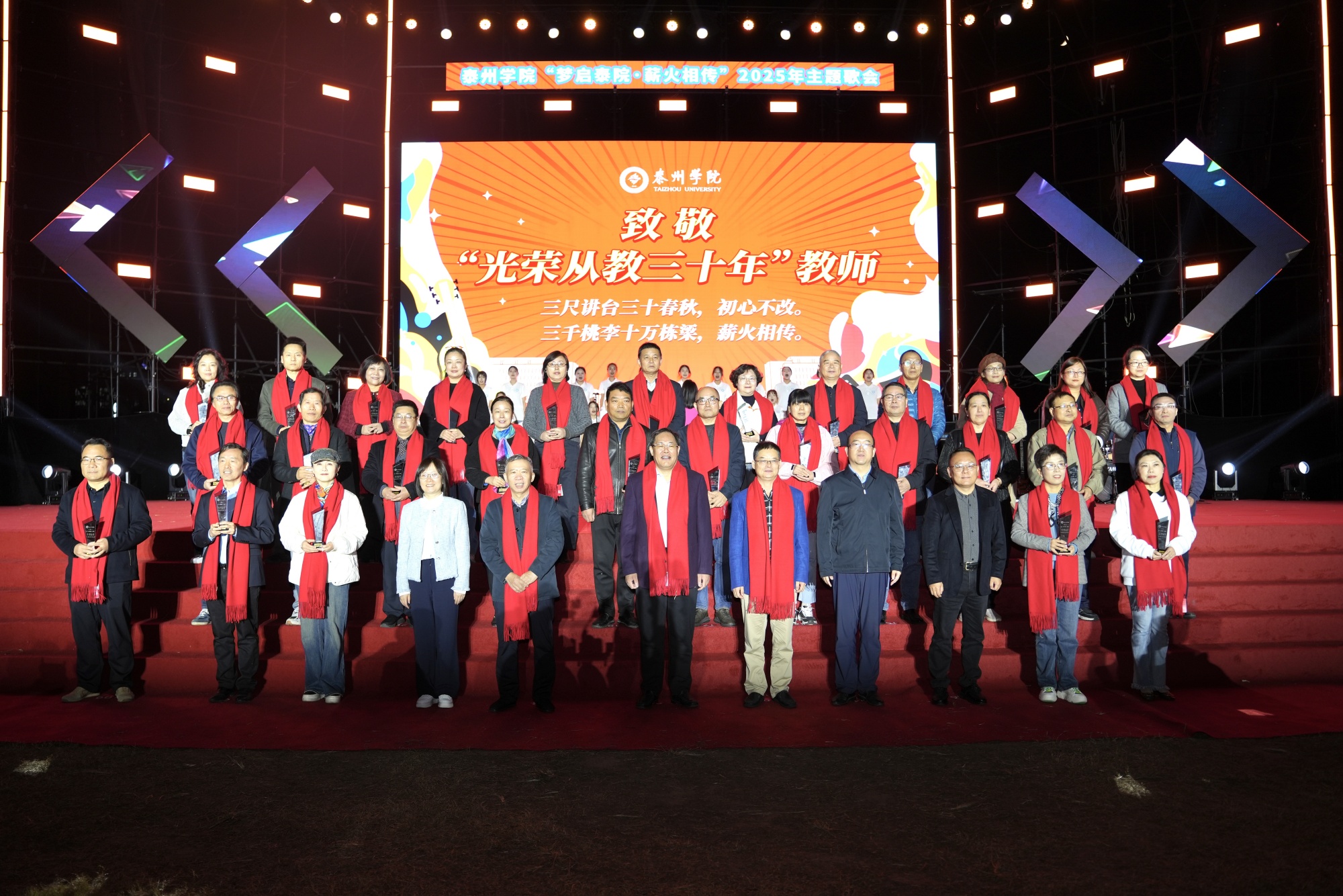 致敬环节温情满溢,成为歌会的动人篇章。为弘扬尊师重教风尚,校领导们为“光荣从教三十年”教师代表逐一颁发荣誉奖牌,并戴上象征敬意的红围巾。伴随着《当我走过老师窗前》的悠扬旋律,全场学生齐声高呼“老师,您辛苦了”,表达对躬身教坛、辛勤耕耘的老师们的崇敬与感谢。